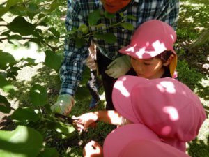 先週、園の近くのリンゴの畑で畑作業をしている方にリンゴの摘果について教えてもらいました。