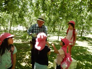 すっかり仲良くなった子どもたち、「私たち、これから原っぱで遊ぶの!」「おじいさんは何時まで仕事をするの?」「お昼まで?」「お昼を食べたらまた畑にくるの?」とおじいさんの時間にも興味を持ち、おじいさんに質問攻めでした。