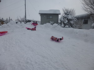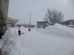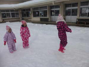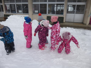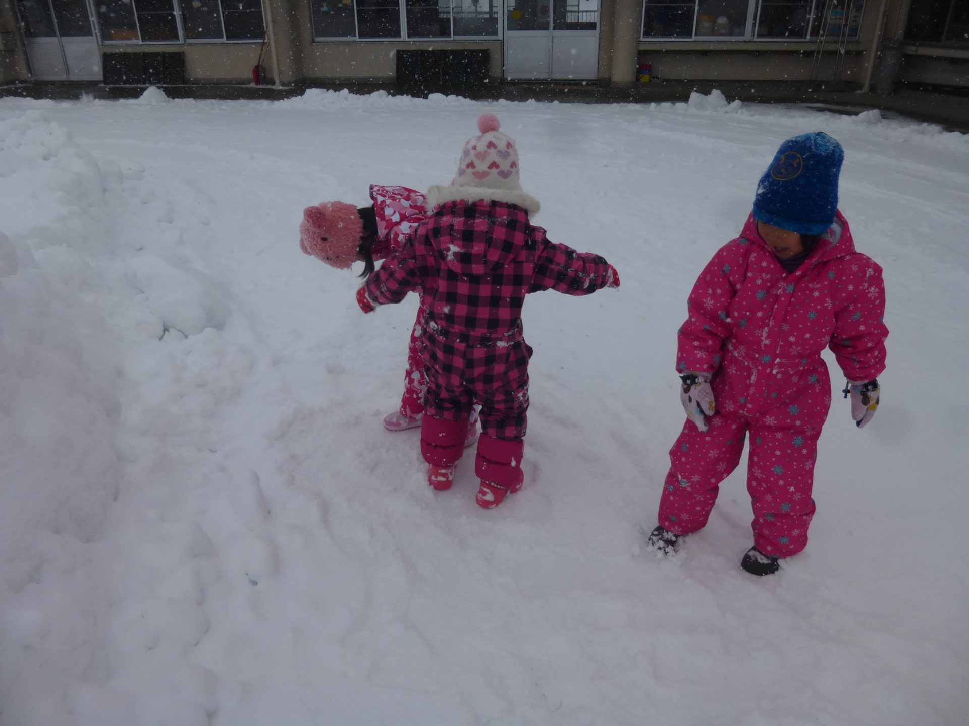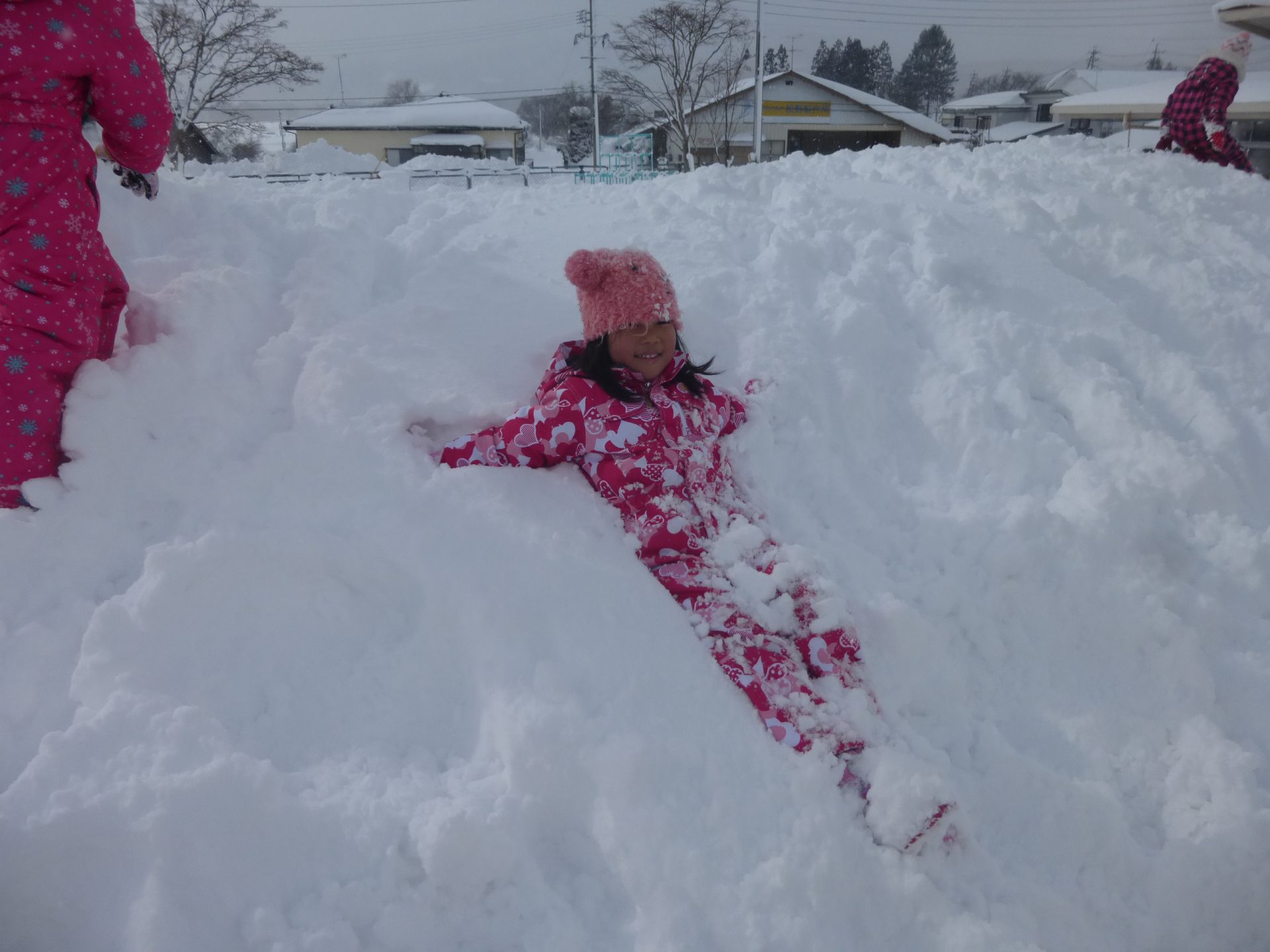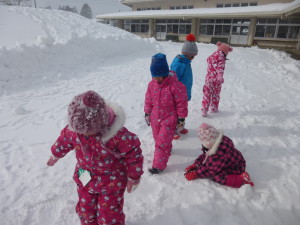 園庭の真ん中にある大きな雪山には雪が積もり、早速ジャンプ!!