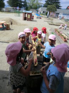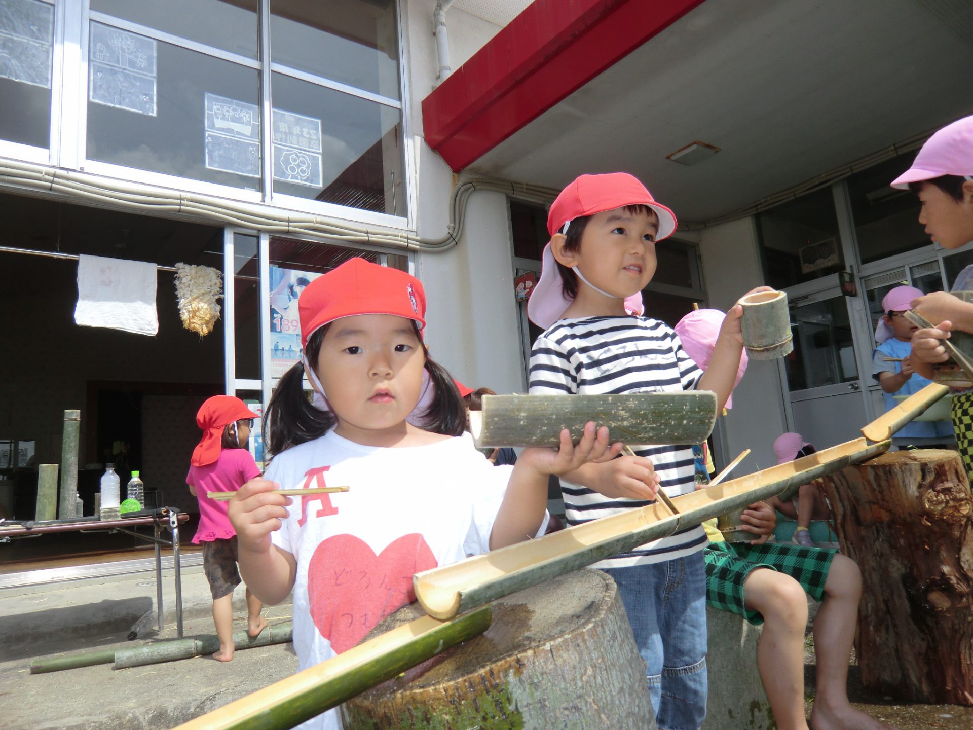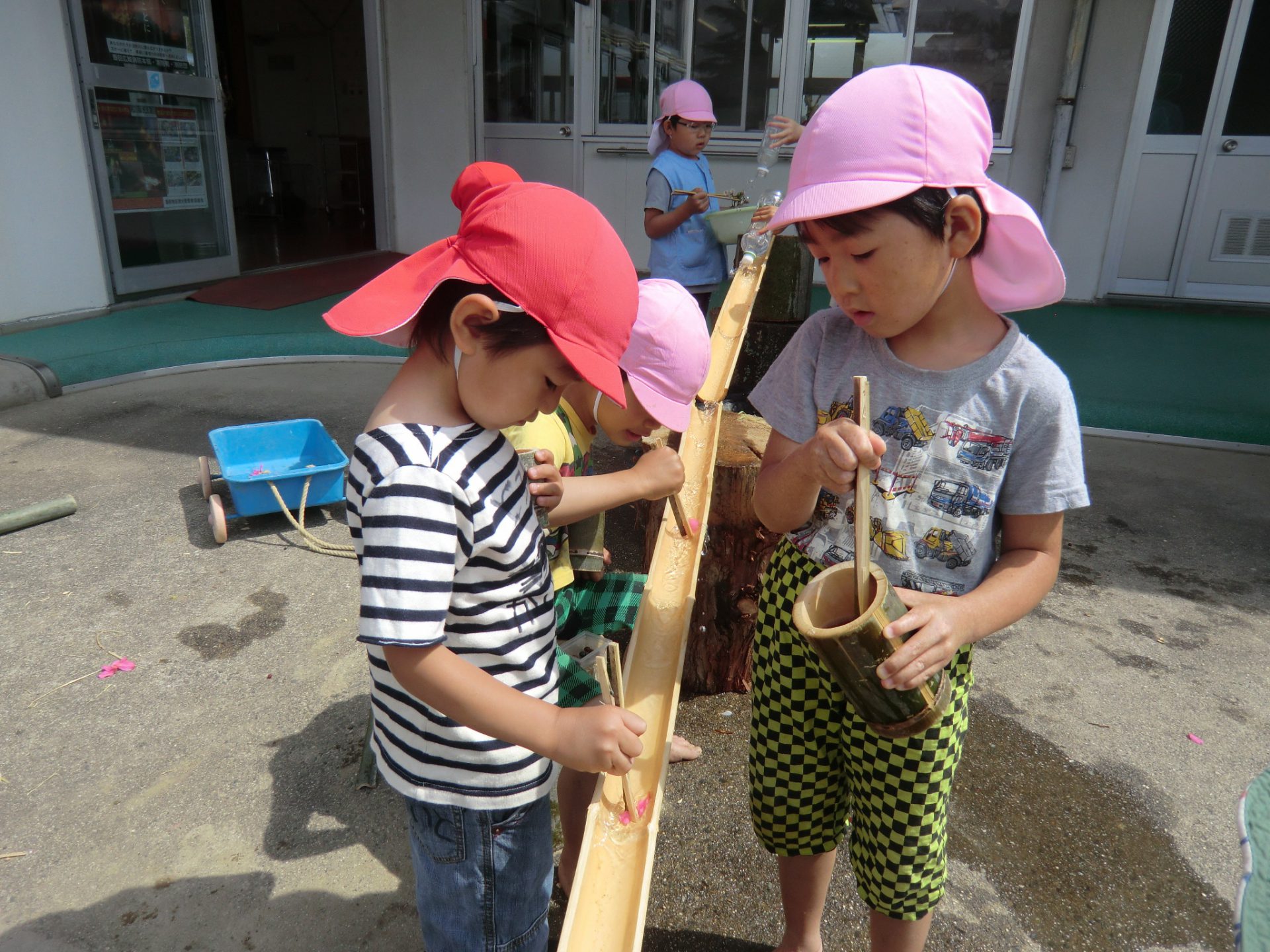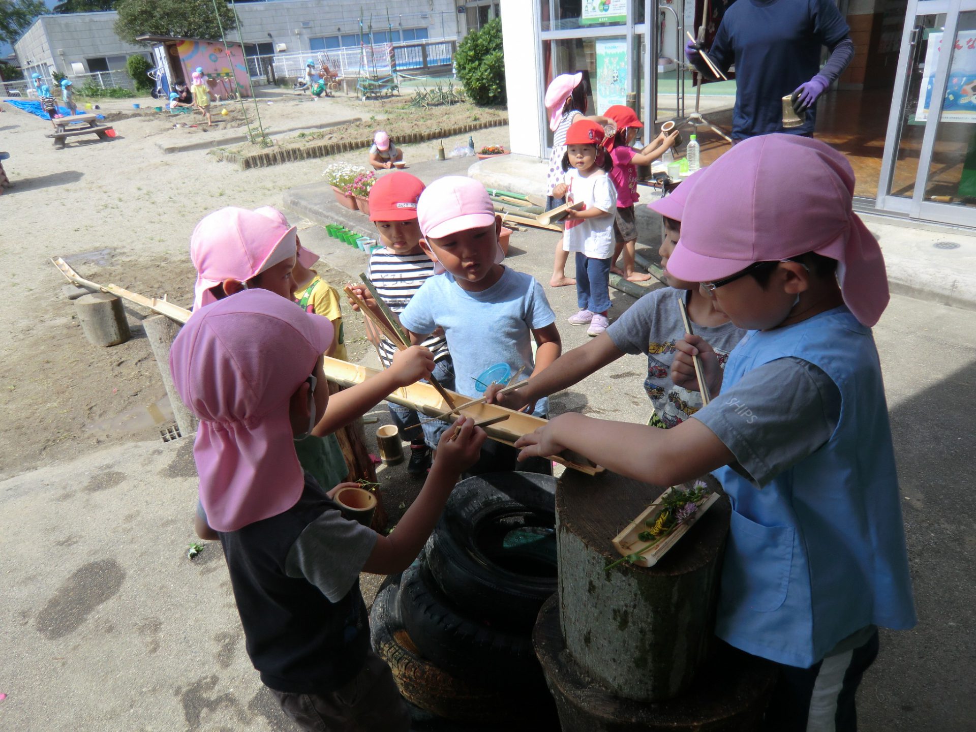 ・流しそうめんごっこもうまく流れなかったり、壊れてしまったりしていますが、子ども達が工夫しながら作っています。この体験を大切にしながら、またちがう竹の使い方がでてくるのを楽しみにしています。