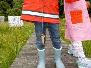 ‘スルメ’を餌にザリガニ釣りを楽しんだ子ども達。でも、竿を引き上げたときにザリガニが落ちてしまうことがありました。
