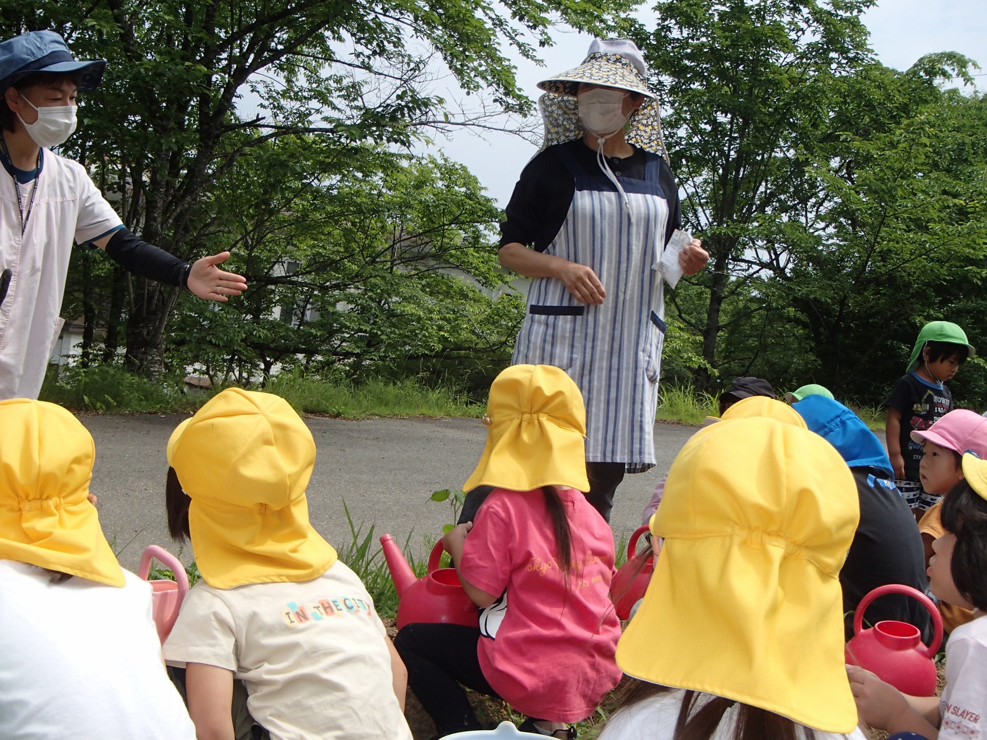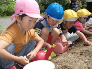 「お水かけたら種がでてきちゃったよ。」「だいじょうぶ!もう一回土をかけてあげればいいんだよ。」