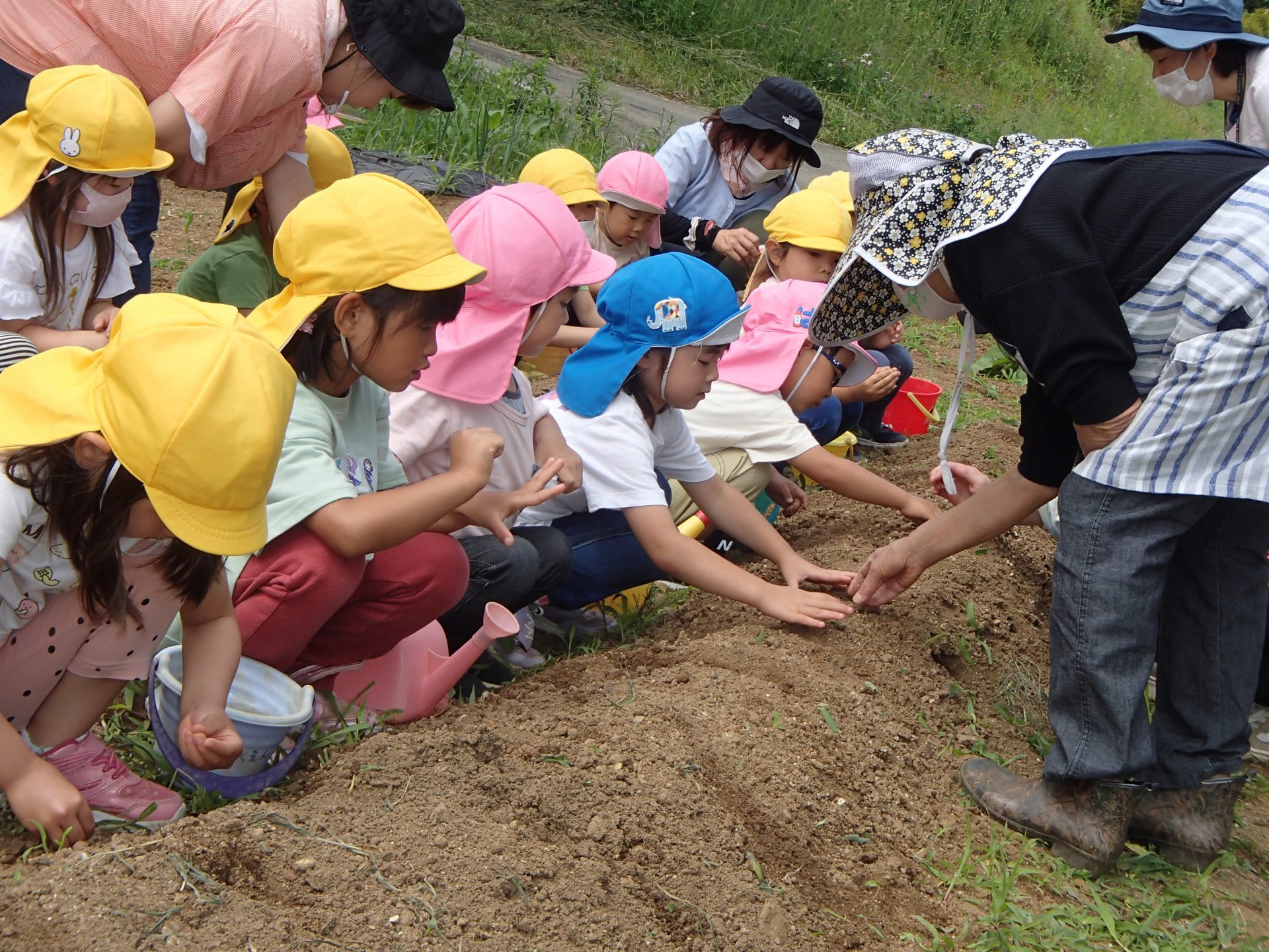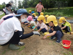 最初に塩澤さんが「種をこぼさないように手をお皿のようにしてね。」「2つぶずつ蒔くんだよ。」と教えてくださいました。