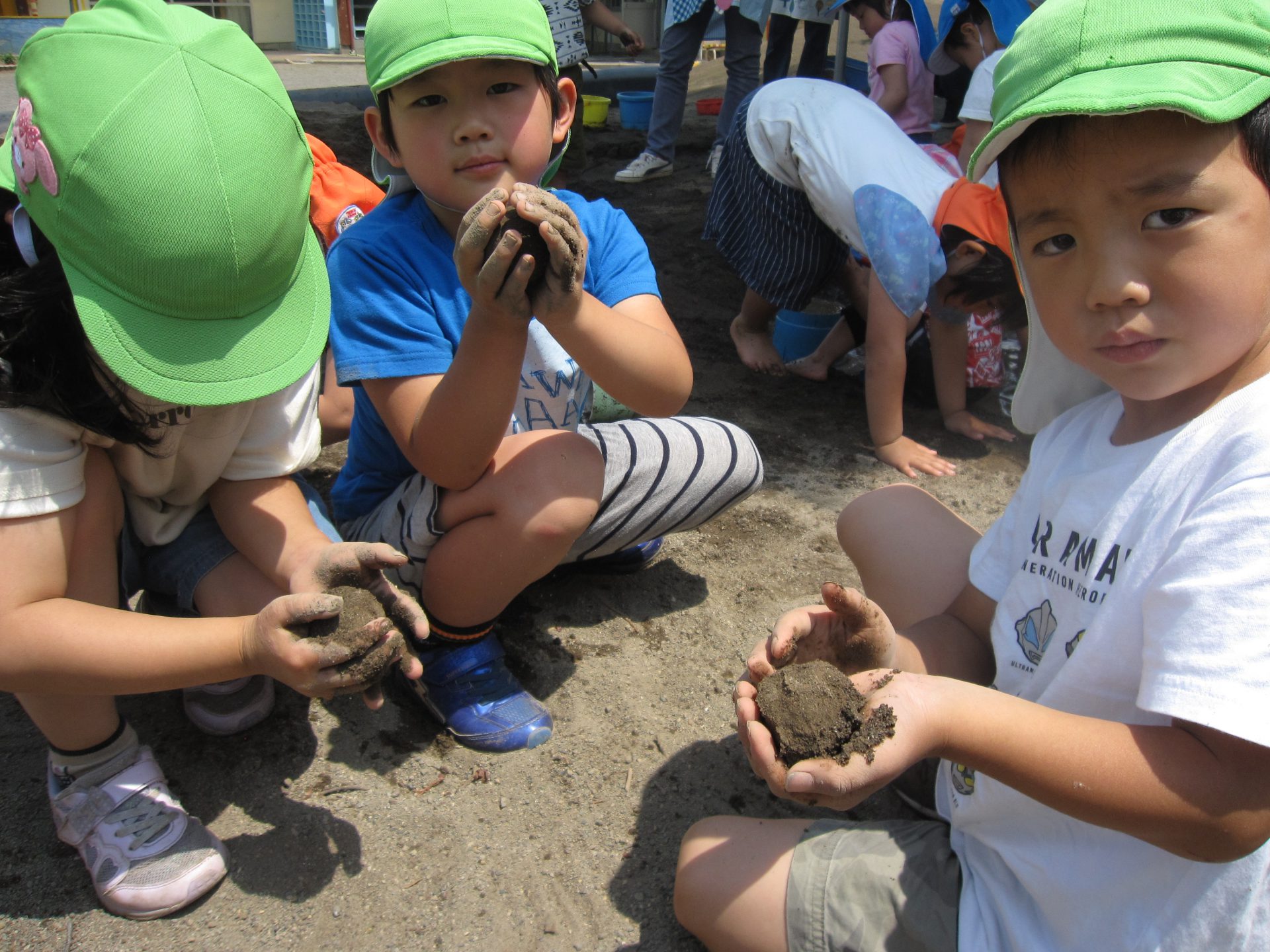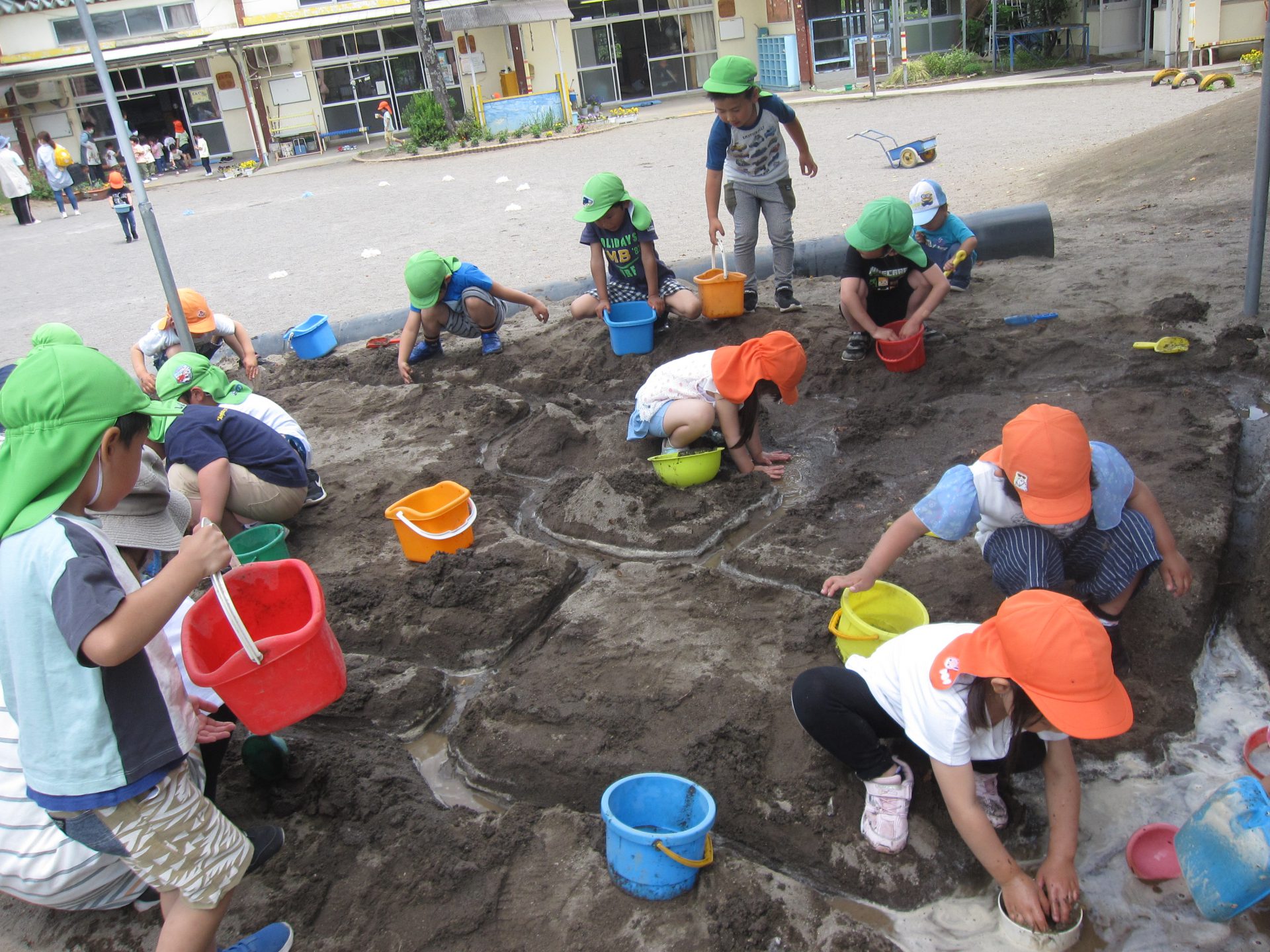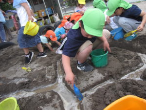 一つの活動をする中にも、穴を掘る子、水を運ぶ子などそれぞれが楽しみや役割を見つけ生き生きと遊んでいました。