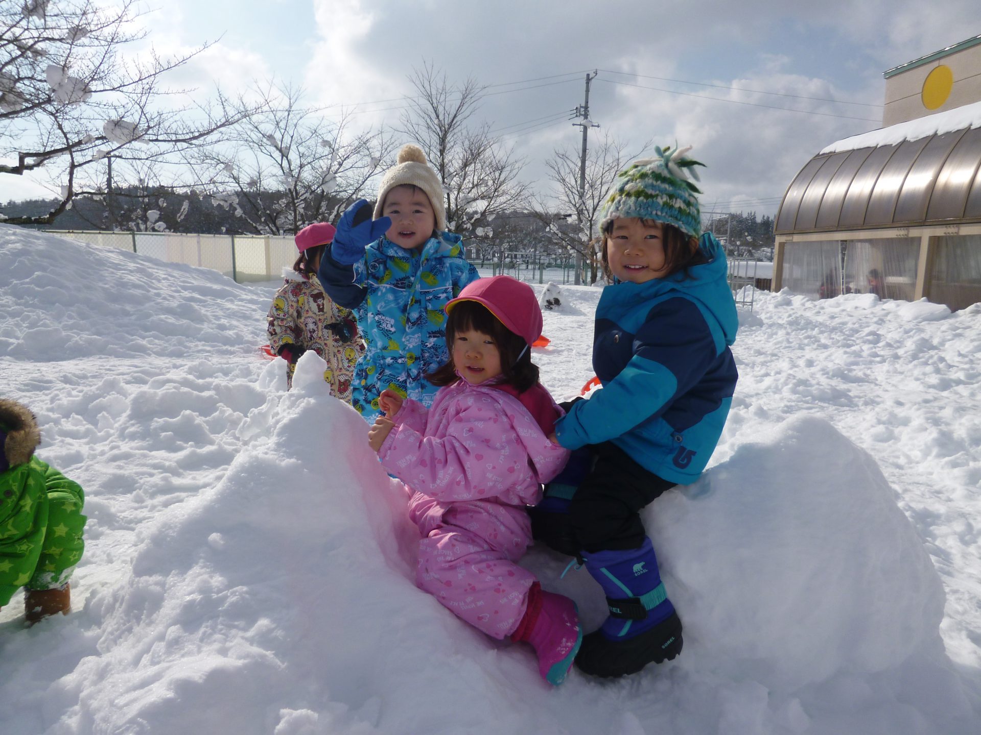 雪の塊にのってにこにこ!子どもたちが乗れば、雪の塊も、素敵な乗り物に大変身!!