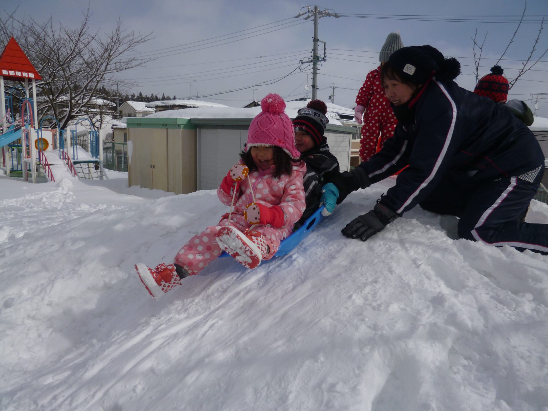 そり遊びだって怖くありません。先生に押してもらって滑ります。