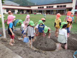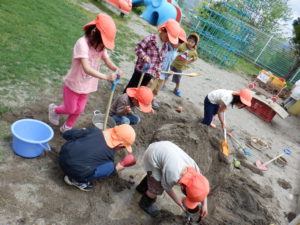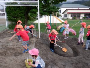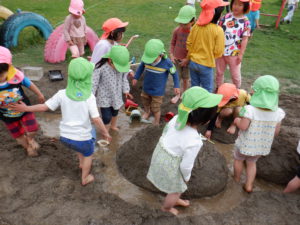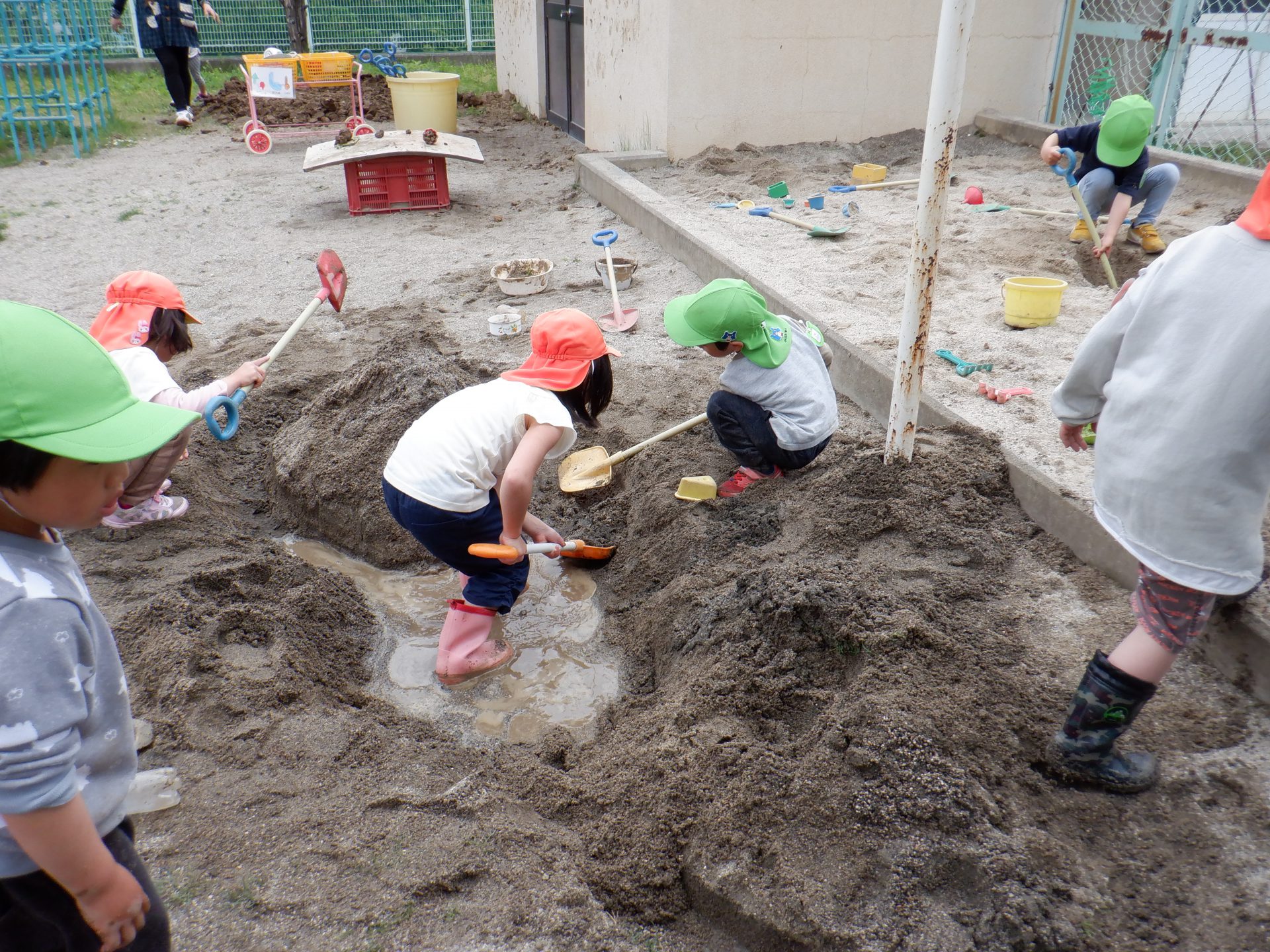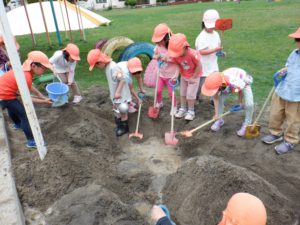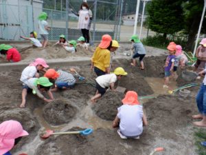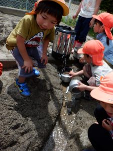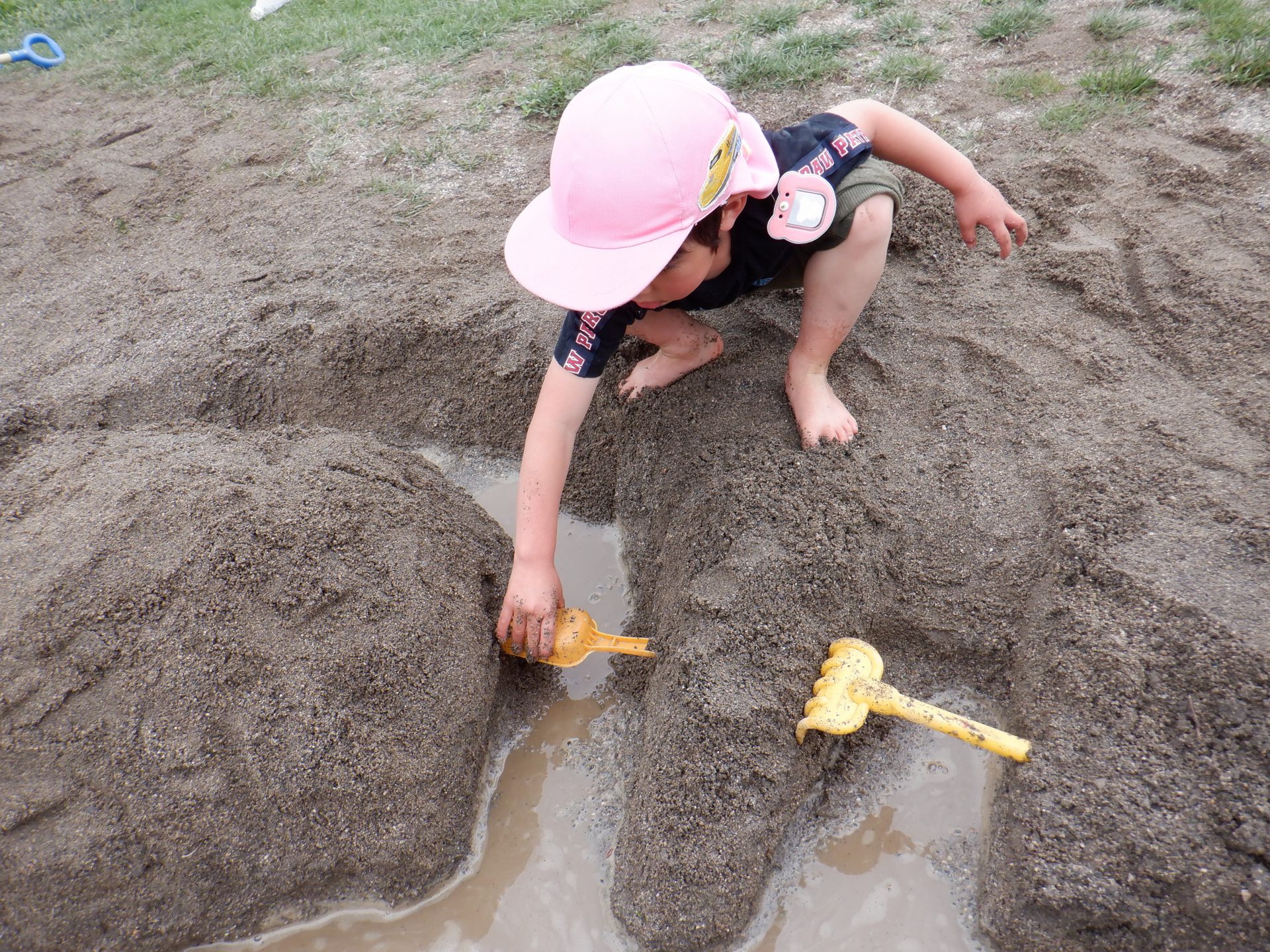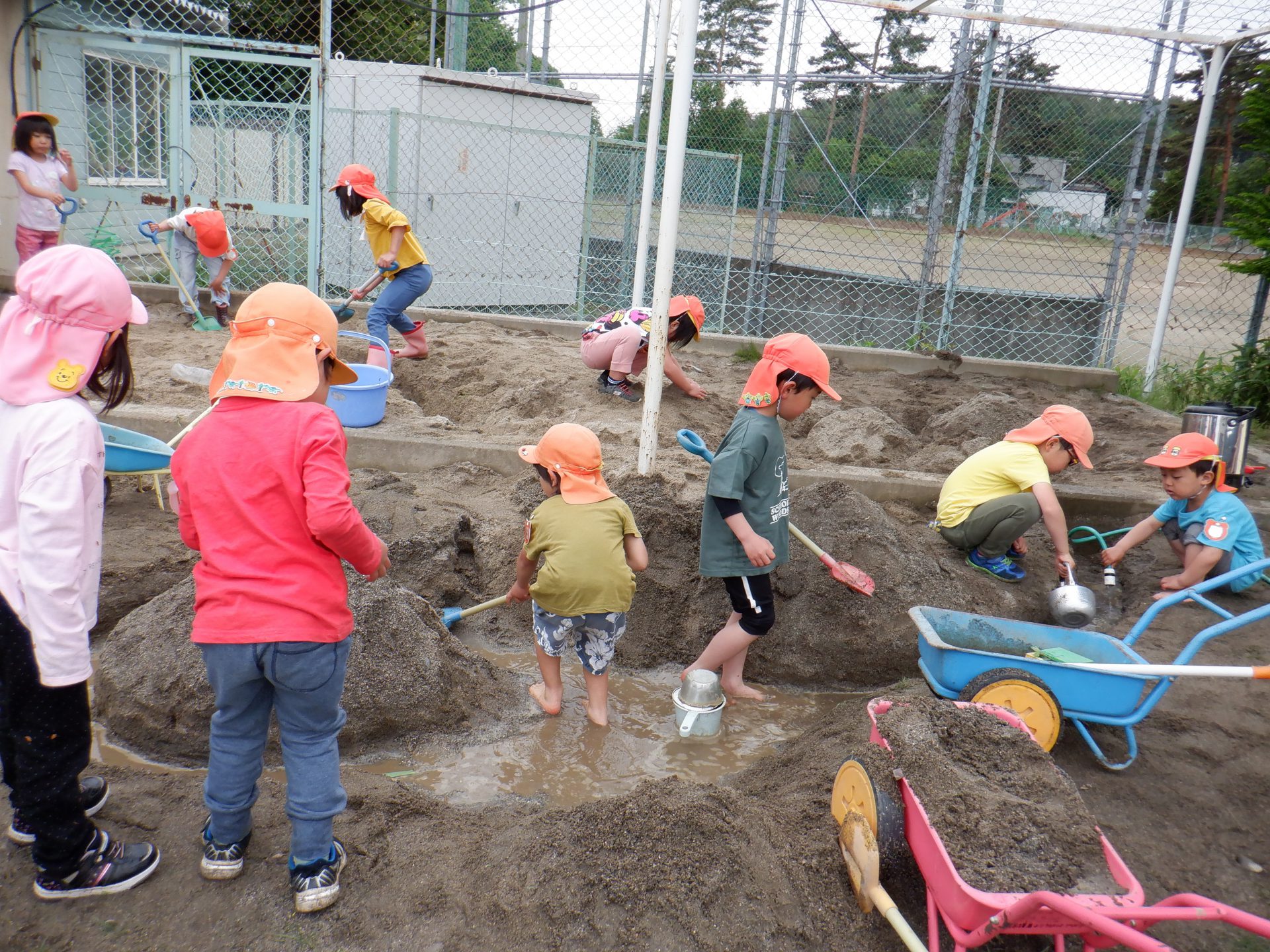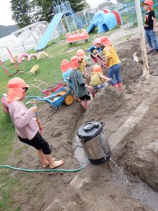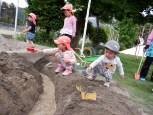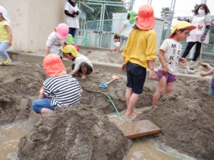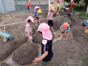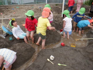 日々それぞれが砂場、色水、鬼ごっこ、虫探しと好きなあそびを楽しんでいましたが、初めてのクラス全員が砂場、川に集まってきました。その中で、協力したり会話が飛び交う姿「今、川どうなってるんだろう?」とお部屋にいても気になり「見てきたい」と自分の気持ちを伝えられたり、帰りにお家の人と作った川をみたり、今日やったことを話す姿、この川作りで子どもたちの嬉しい姿がたくさん見られました。