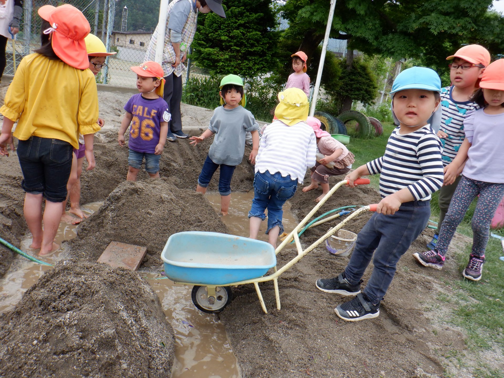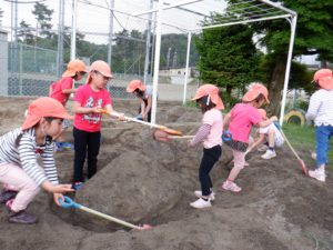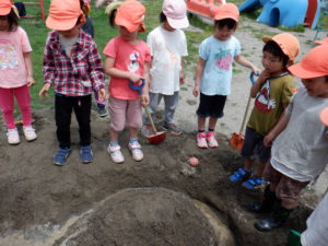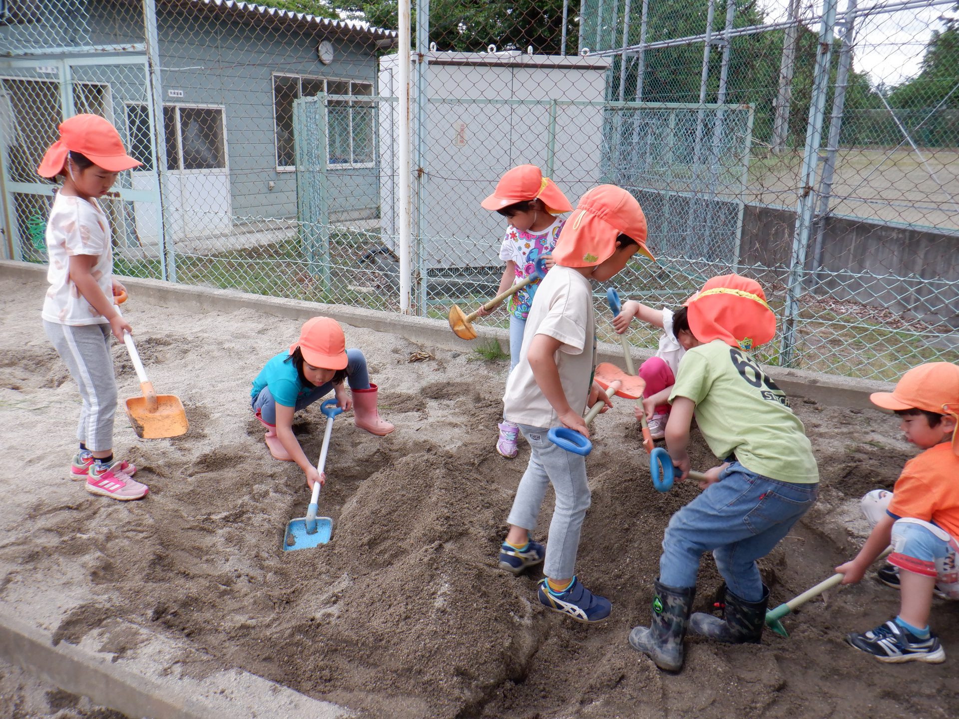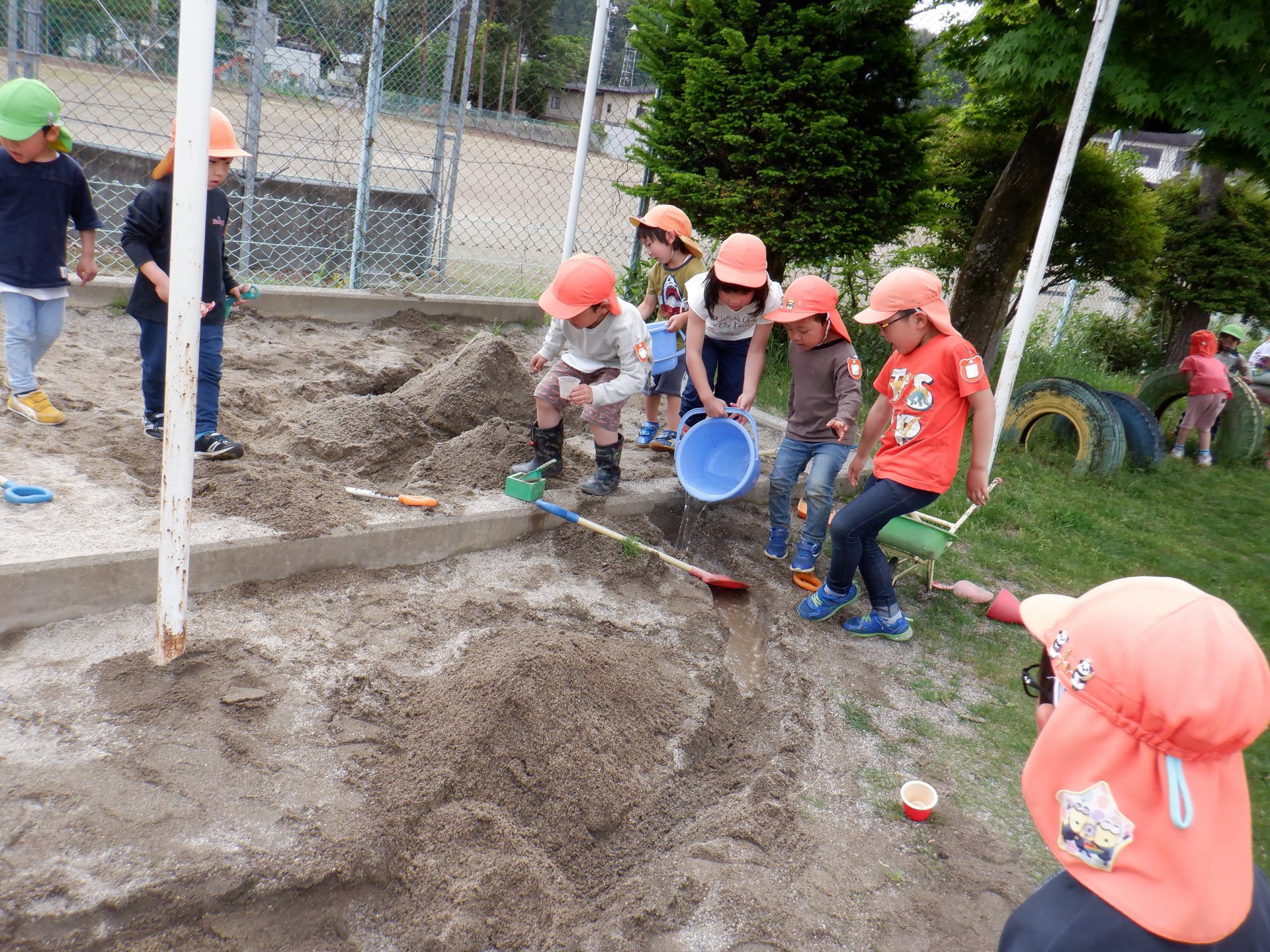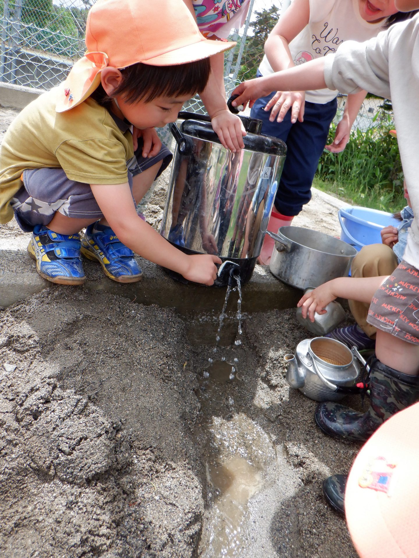 日々それぞれが砂場、色水、鬼ごっこ、虫探しと好きなあそびを楽しんでいましたが、初めてのクラス全員が砂場、川に集まってきました。その中で、協力したり会話が飛び交う姿「今、川どうなってるんだろう?」とお部屋にいても気になり「見てきたい」と自分の気持ちを伝えられたり、帰りにお家の人と作った川をみたり、今日やったことを話す姿、この川作りで子どもたちの嬉しい姿がたくさん見られました。