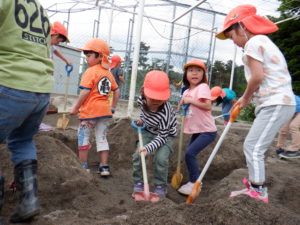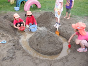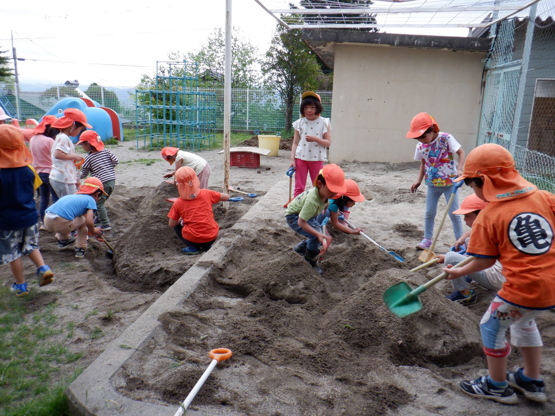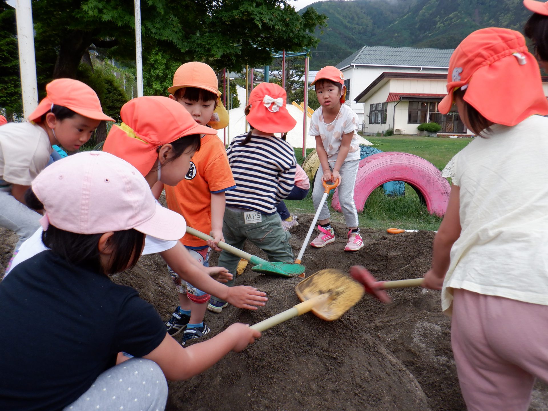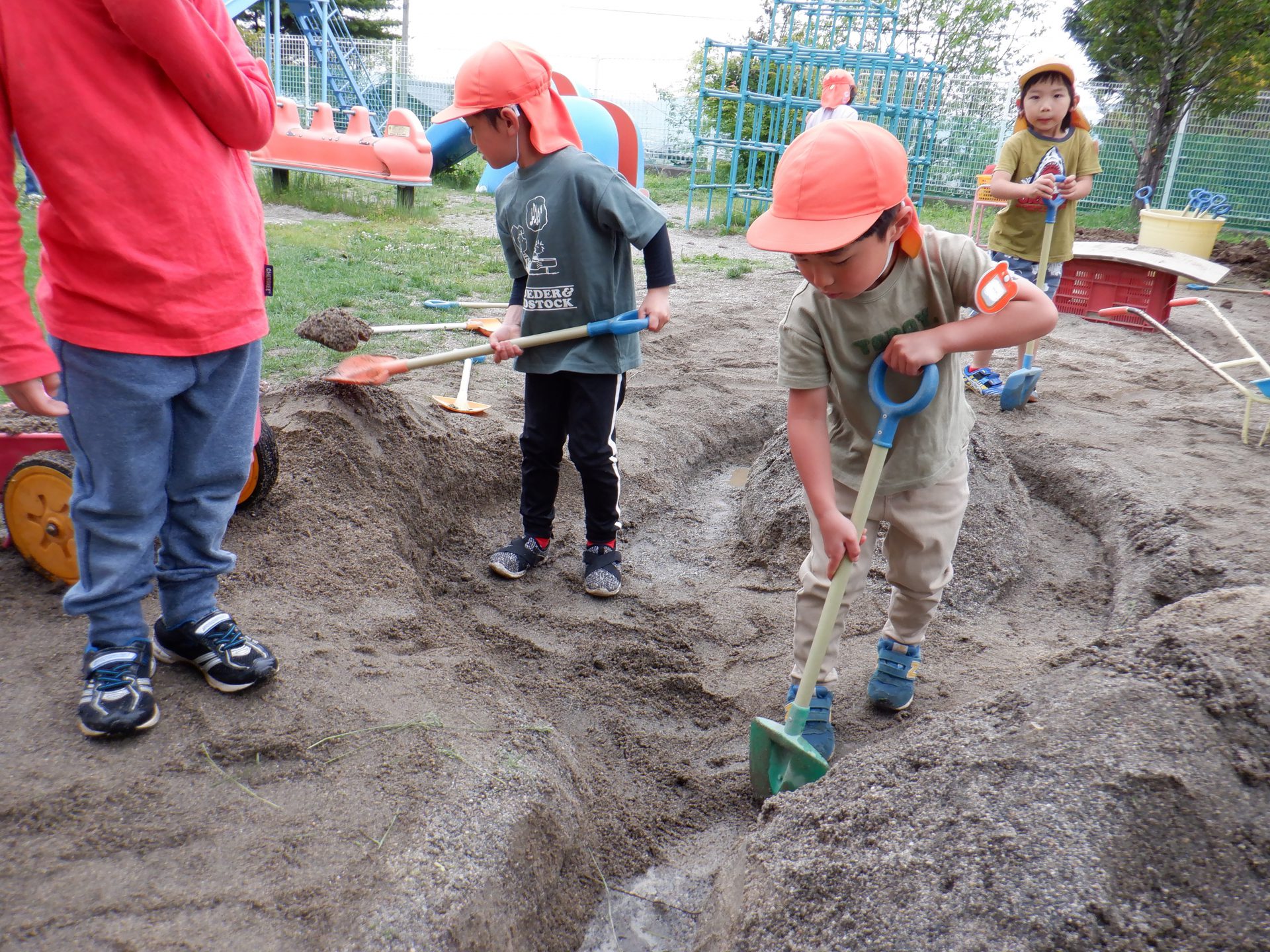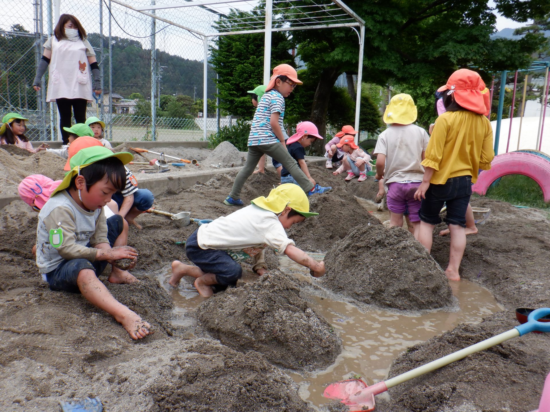日々それぞれが砂場、色水、鬼ごっこ、虫探しと好きなあそびを楽しんでいましたが、初めてのクラス全員が砂場、川に集まってきました。その中で、協力したり会話が飛び交う姿「今、川どうなってるんだろう?」とお部屋にいても気になり「見てきたい」と自分の気持ちを伝えられたり、帰りにお家の人と作った川をみたり、今日やったことを話す姿、この川作りで子どもたちの嬉しい姿がたくさん見られました。