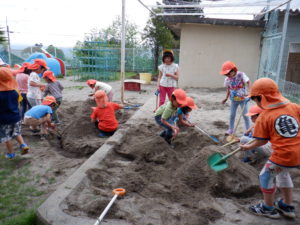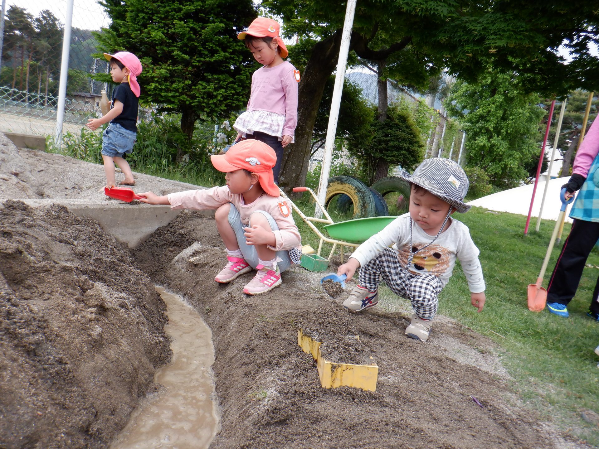 「今日は川作りの続きをするから早く行く」と朝から張り切っていました。と日々、保護者から聞かれる声。「あたしもやりたい!」の子どもの声。次の日・・・次の日・・・と続いていったあそび。協力したり、ひとつのあそびを楽しむ姿、自発的な言葉がたくさん聞かれたり、川作りって魔法のあそびかも・・・・。と思いました。