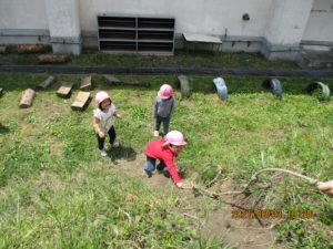 しばらく土手登りに夢中になっていると、土手の下から「あっ!ダンゴムシ!」という子どもの声が聞こえてきました。その声に、なんだなんだと他の子どもたちも集まっていきます。自分でダンゴムシ捕まえたり、保育士に手に乗せてもらったりしながらどんどんダンゴムシを集め、「ダンゴムシほしい…。」と一言。どうやらお部屋に連れて帰りたかったようです。すると「じゃあおうちがいるよね!」「葉っぱとかいるかな?」「おもちゃも!」と次々声があがり、ダンゴムシのお家作りがスタートしました。