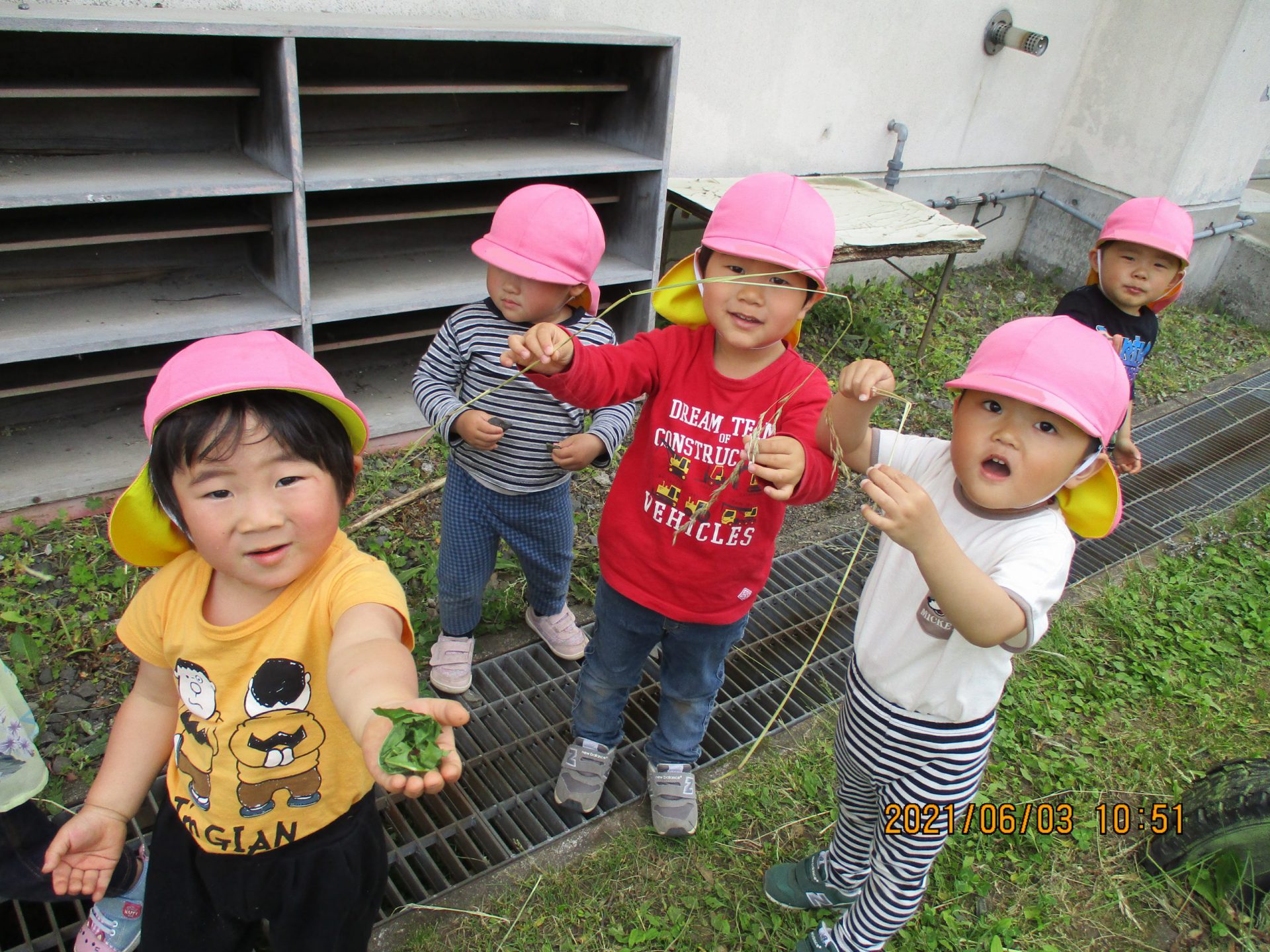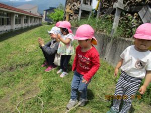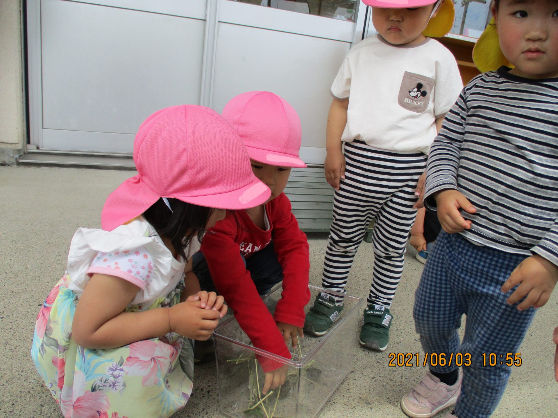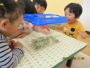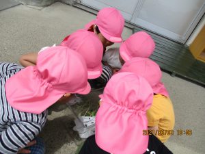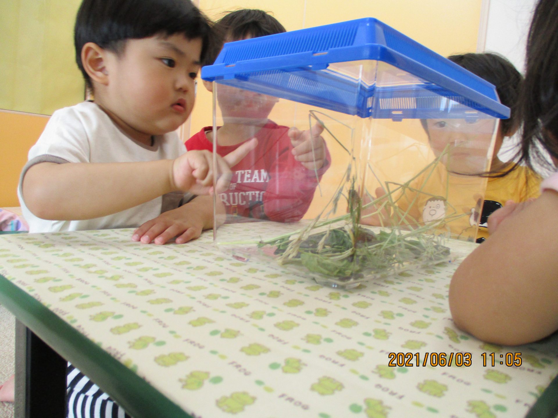 また、虫カゴをみんなで囲って眺める中で、よく見ようと虫カゴを動かす子がいると「動かしたらだめなんだよ。びっくりしちゃうよ。」とダンゴムシの気持ちを考えだす姿も見られるようになってきました。深く関わっていくことで少しずつ小さな生き物との接し方を学んでいく姿から、これからも様々な生き物との関わりを通して命の大切さ、尊さを感じていってもらえたらと思います。