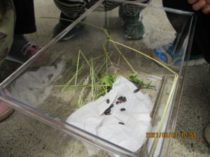 お部屋の前に着き、虫カゴを開けると「ここでいいかな。」「僕も早くいれたい!」と自分たちの手で丁寧に草や石を入れていました。