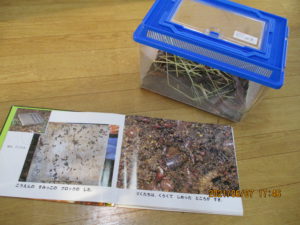 しばらくして子どもたちがご飯の時間になると、「ダンゴムシさんって何食べるんだろうね?」という話に。お部屋にみんなのお気に入りのダンゴムシの本があったので、その本を見て勉強することになりました。本を見て「えー!」「葉っぱ食べるんだねー!」と驚きの声があがり、同時に土が必要なことやじめじめしたところが好きだということも分かってきました。