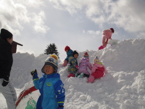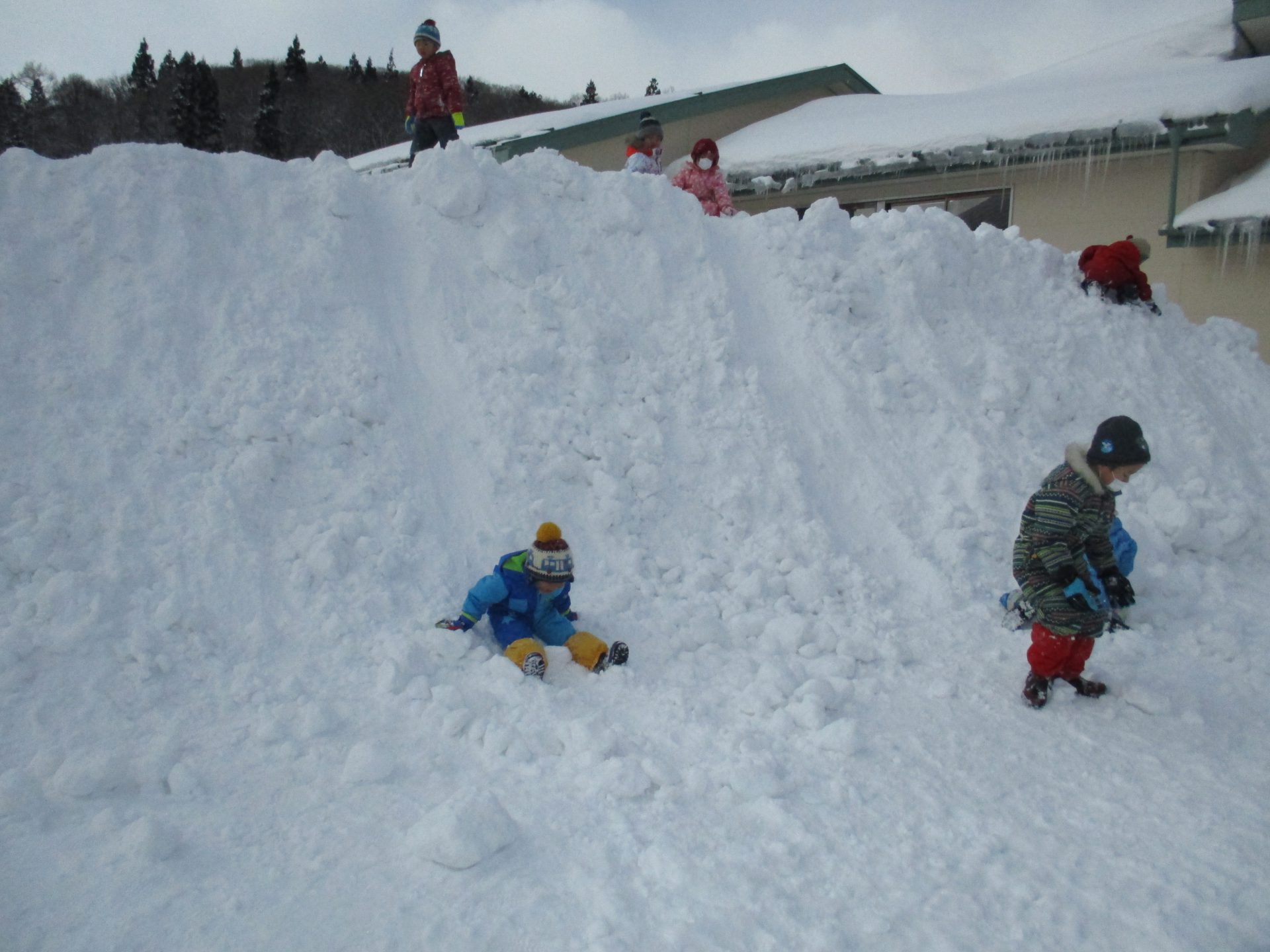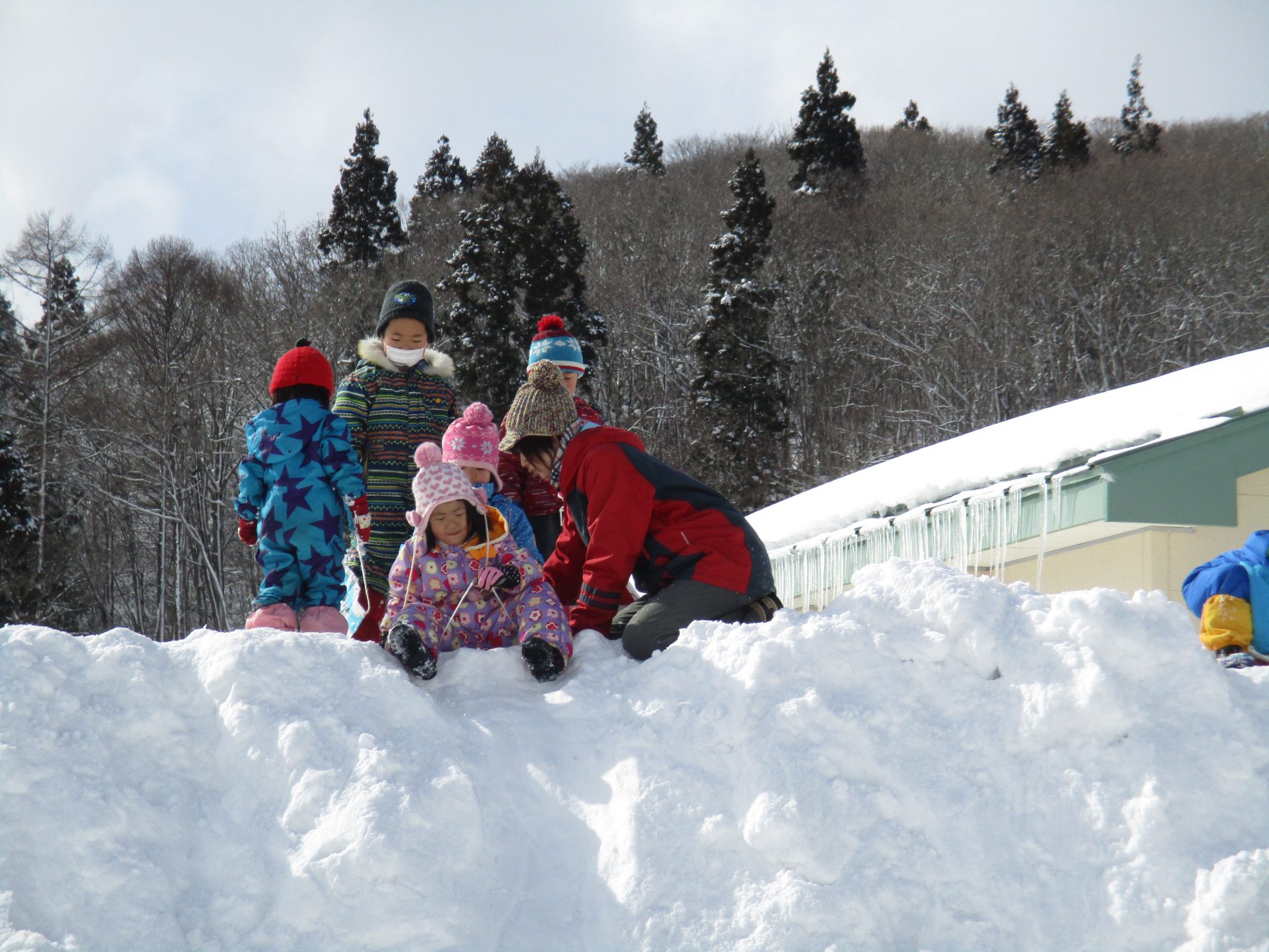 雪遊びが始まった頃は、「階段無いから、登れない」と諦めてしまう姿が多かったです。しかし、今では「ごつごつしてて楽しい」「ここに足入れれば落ちないかな?」とたくましく雪山に登っています。普段から異年齢で活動する時間が多いためか、自然のなかで年下の子を思いあったり優しく接したりすることができると感じています。思いやりや優しさを受け取った子どもたちが、自分より年下の子に対しても同じように接することができるのでしょうね。