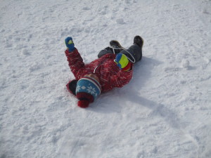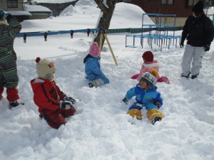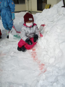 1歳児・2歳児さん、膝を付きながら雪山へ。