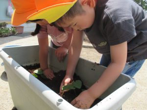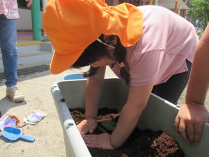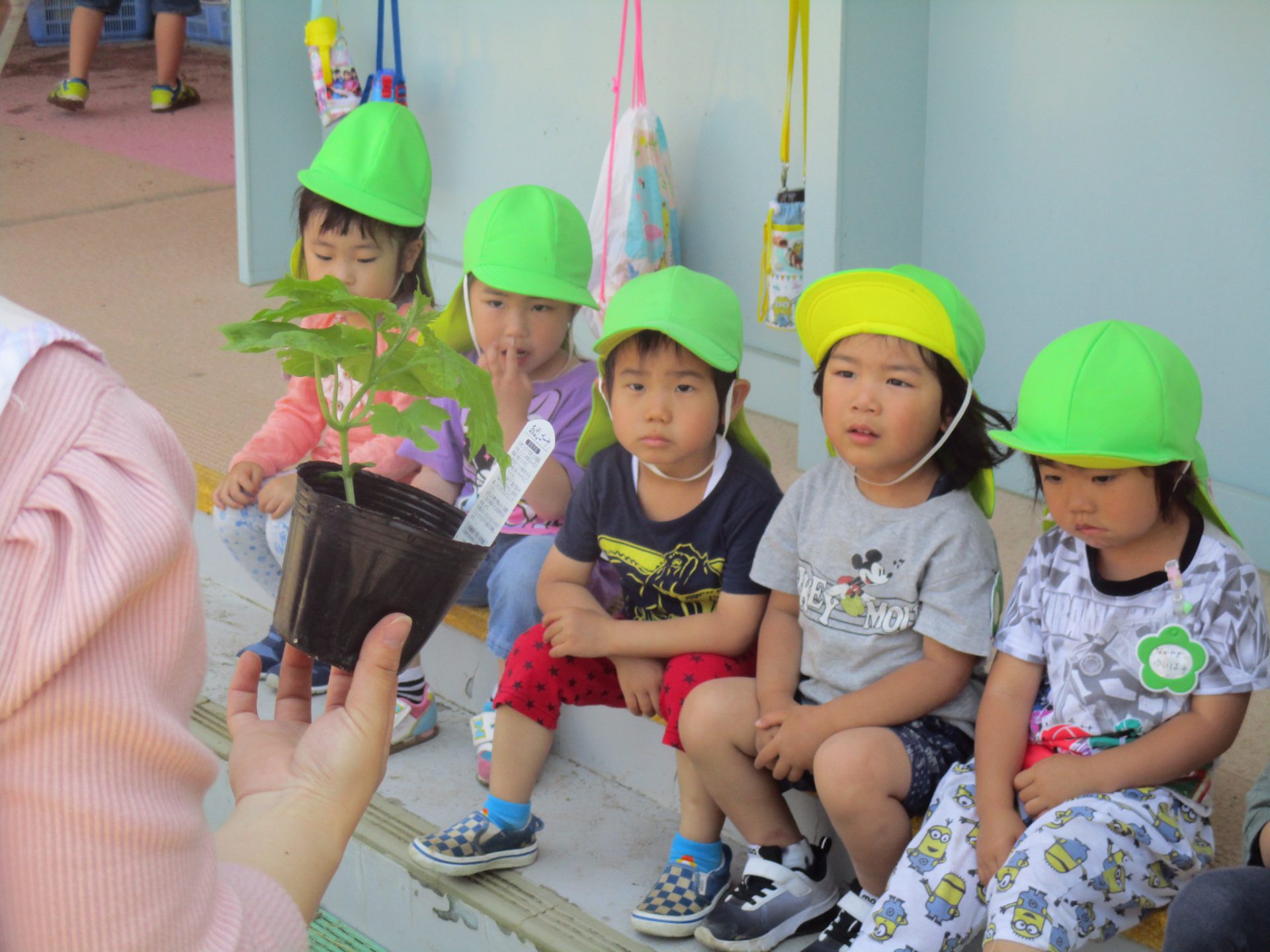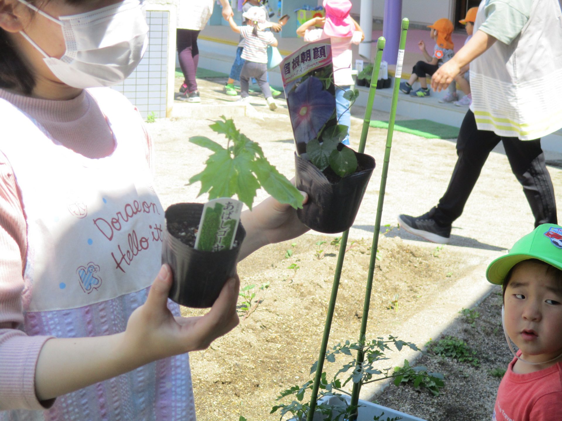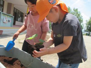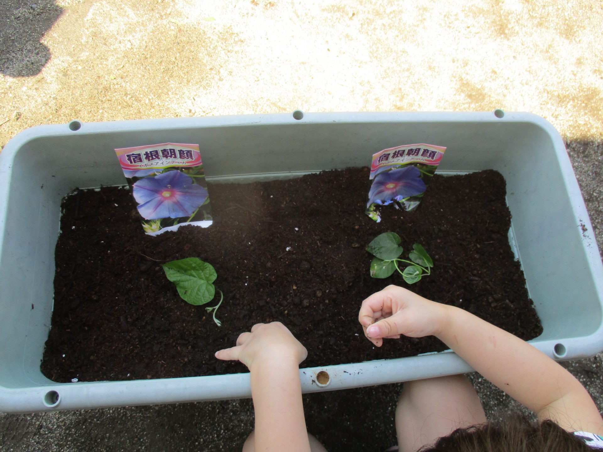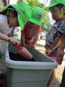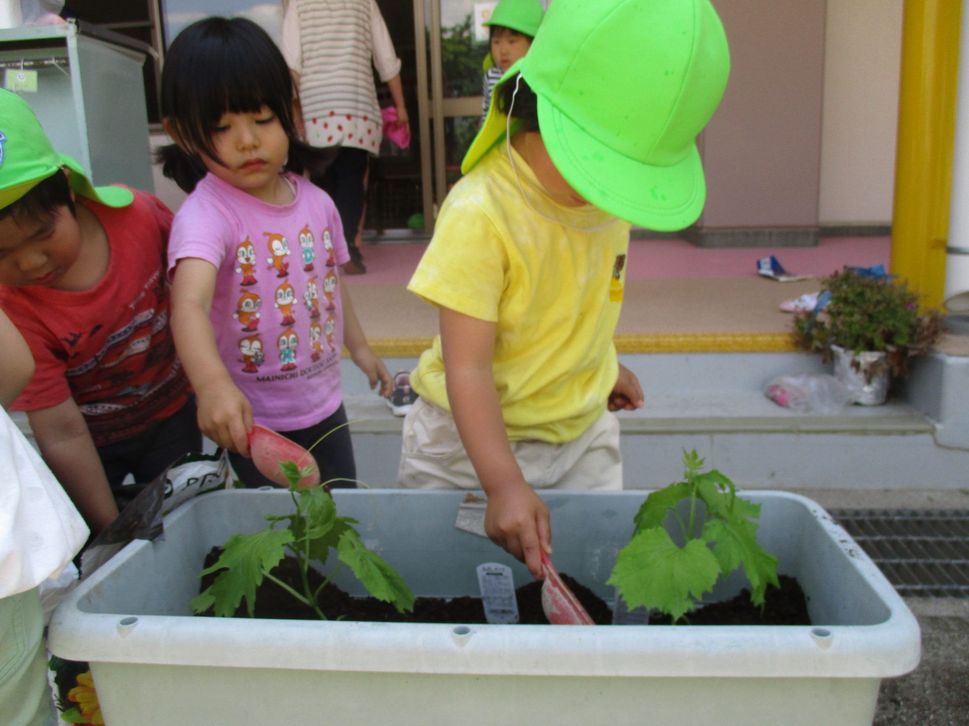 園庭の畑は狭く、限られていますが、その中でもいろいろな植物に触れていって欲しいと思います。