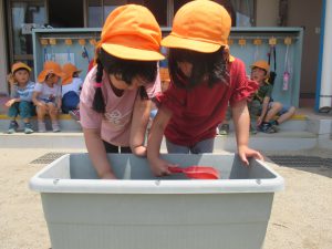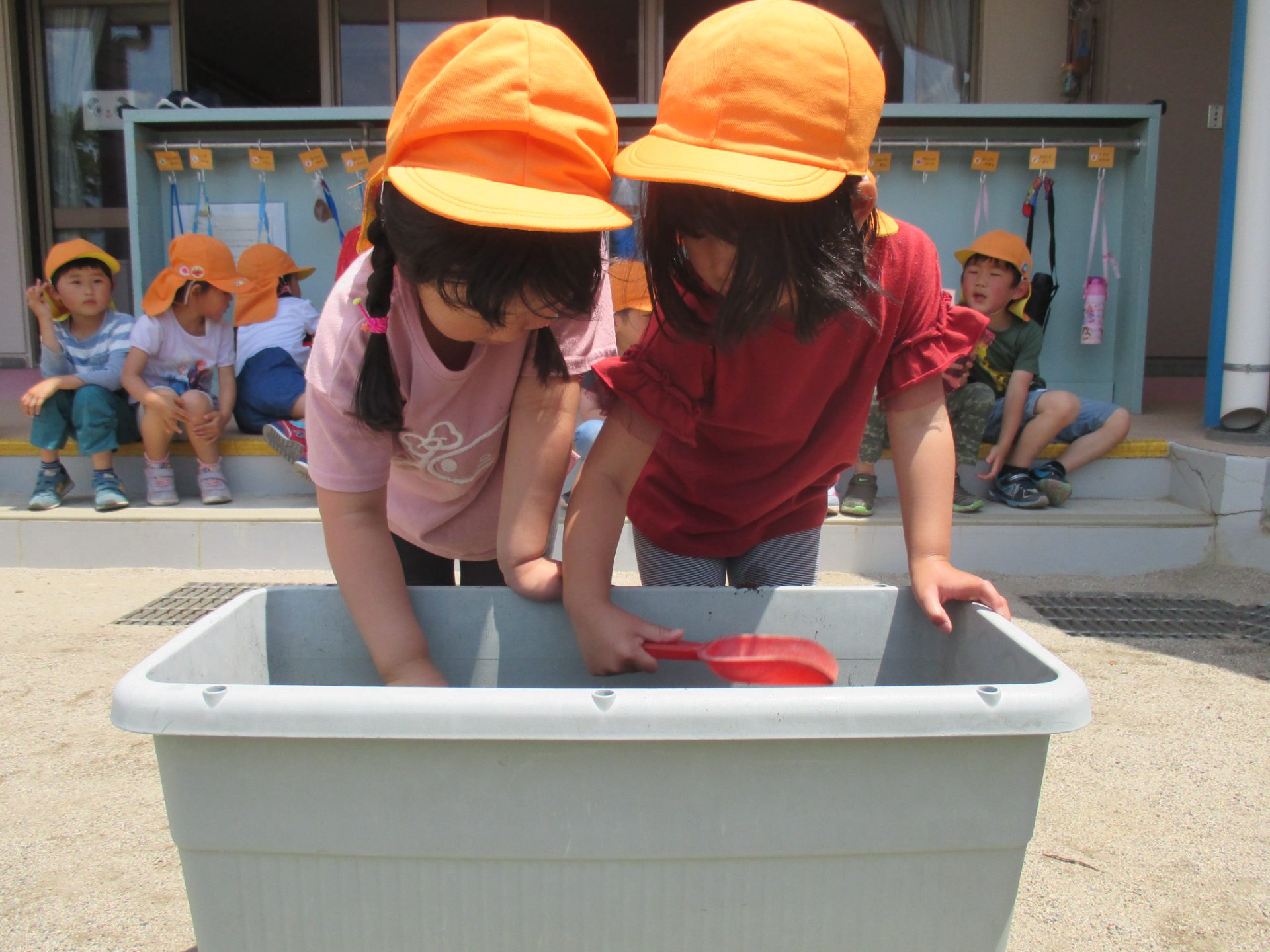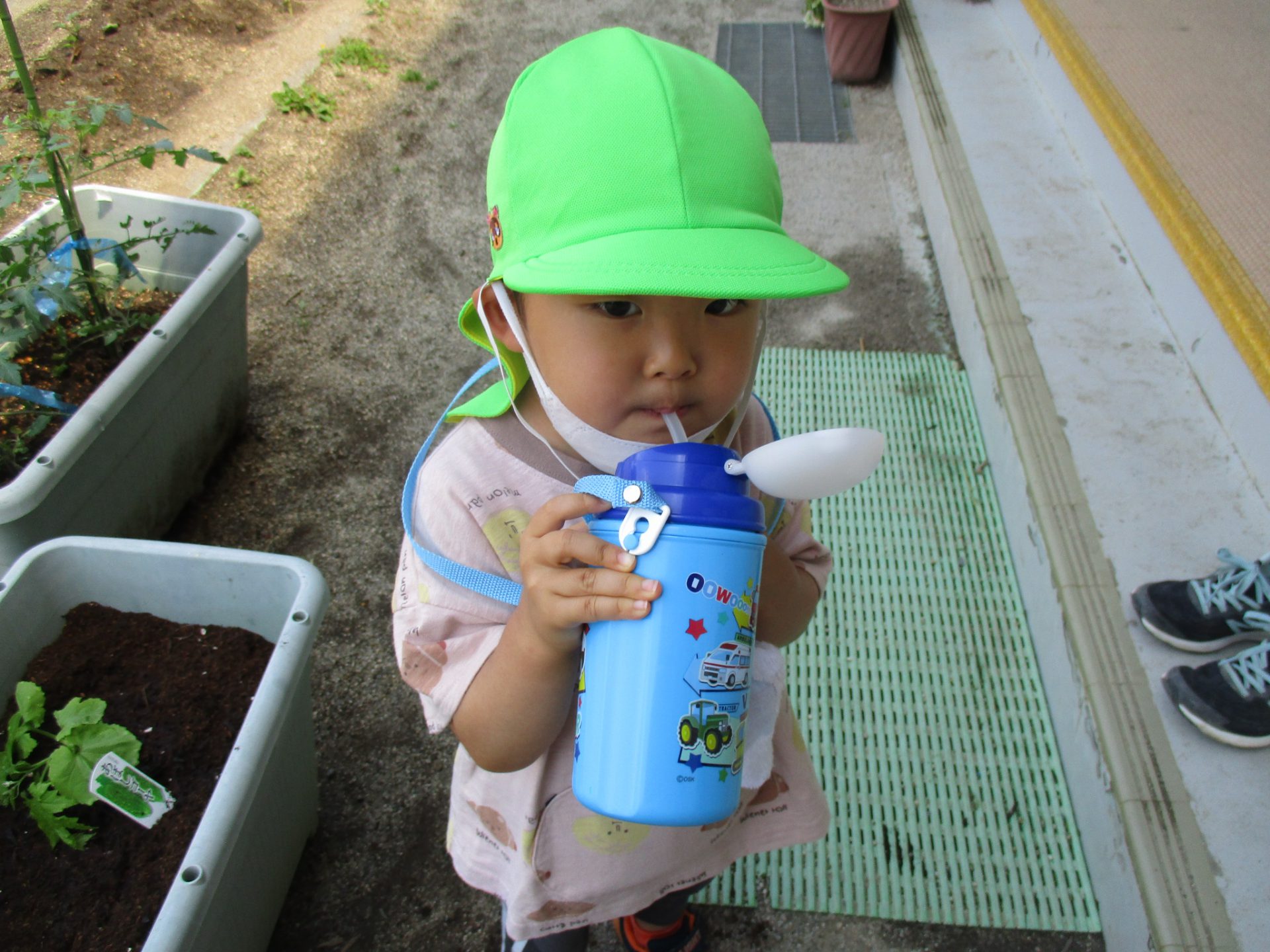 年少さんは先日ミニトマトの苗植えをしたことで、植物には水が必要だと感じたようです。