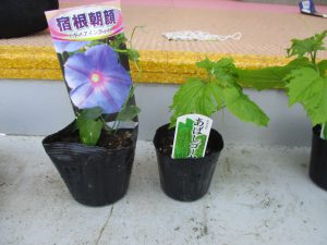夏に「みどりのカーテン」になるよう、環境課の方からアサガオ、ゴーヤの苗をもらいました。