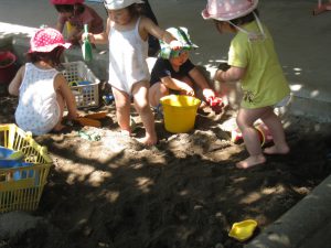 1歳児クラスのお友だちも、砂場で遊びはじめました・・・