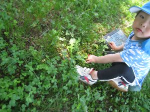 「あった!」と、へびイチゴの赤い実を見つけて大喜び。