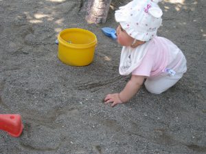 0歳児の、お友だちもお砂遊び、初体験!大きいお兄さん、お姉さんが歓声をあげながら遊んでいる様子を見ながら、お砂の感触を楽しんでいました。