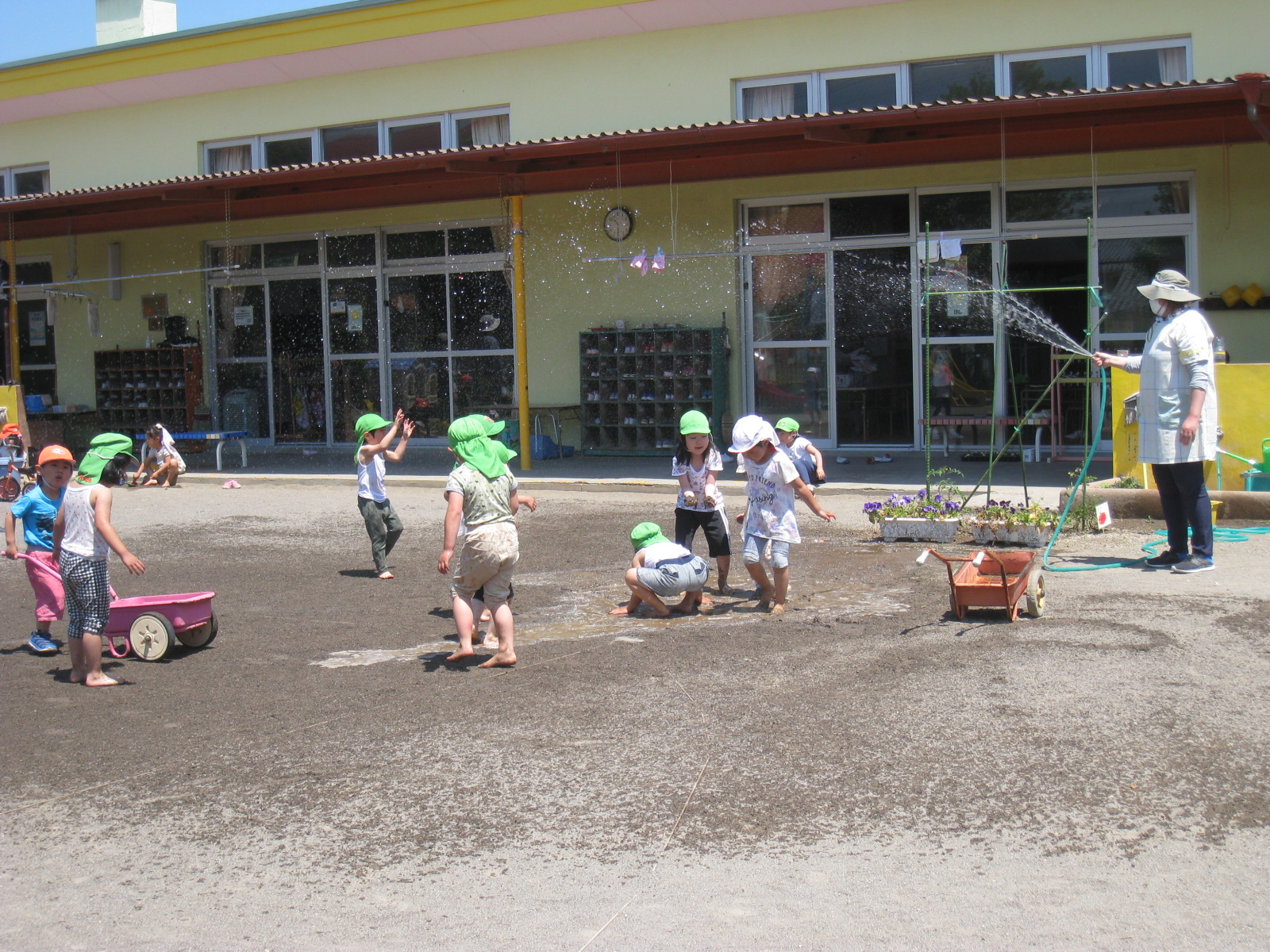 保育園では、水遊びがスタート!キャーキャー大喜びの子どもたち。
