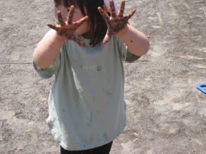 3歳児:泥に触れ、チョコレート作りながら、「ぐにゅぐにゅして変な感じ~!」と笑顔いっぱい。