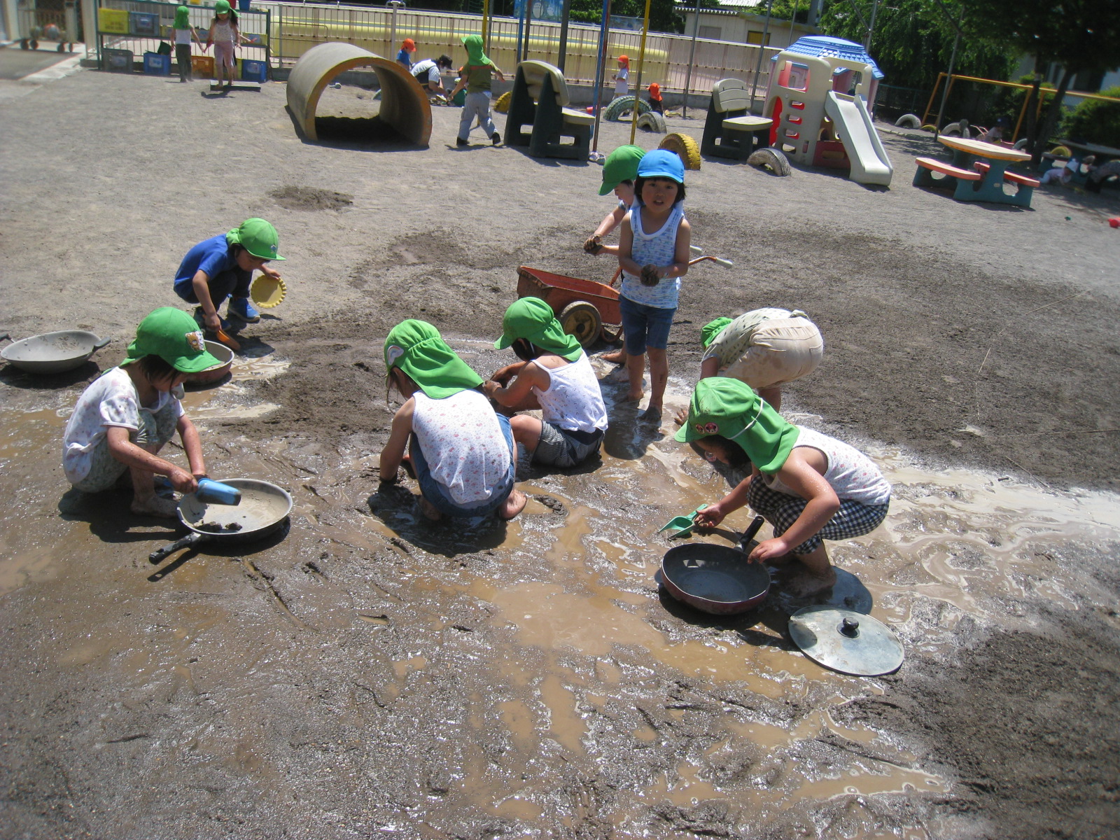 泥んこクッキングをしたり、いろいろな形で泥の感触を楽しんでいました。