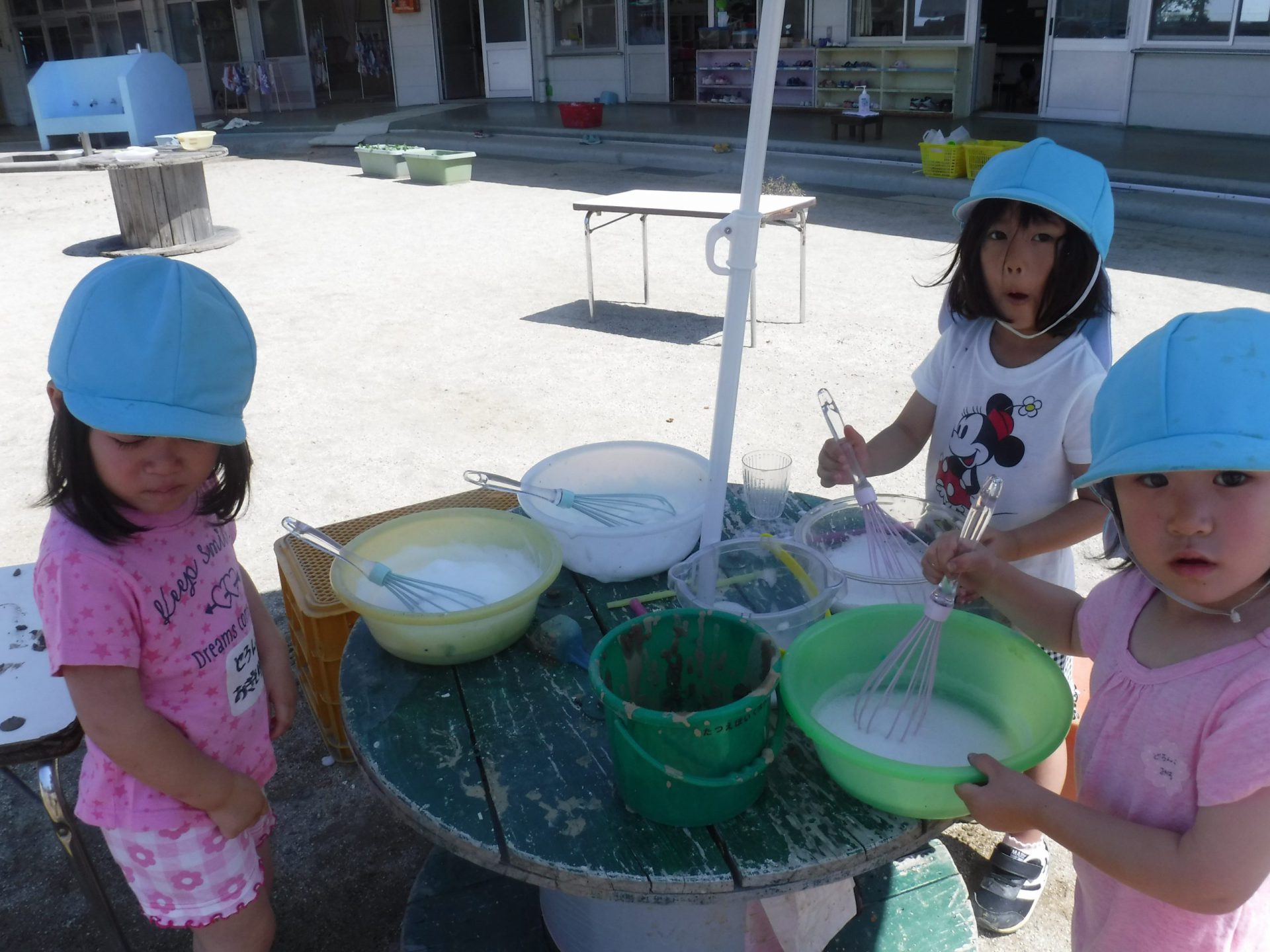 別のコーナーでは固形石鹸を削ってアワアワ作り、泡だて器混ぜるとドンドン泡が出来て手ですくったり、洋服につけてみたり、「いっぱい泡がでてきたよ。」