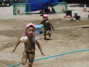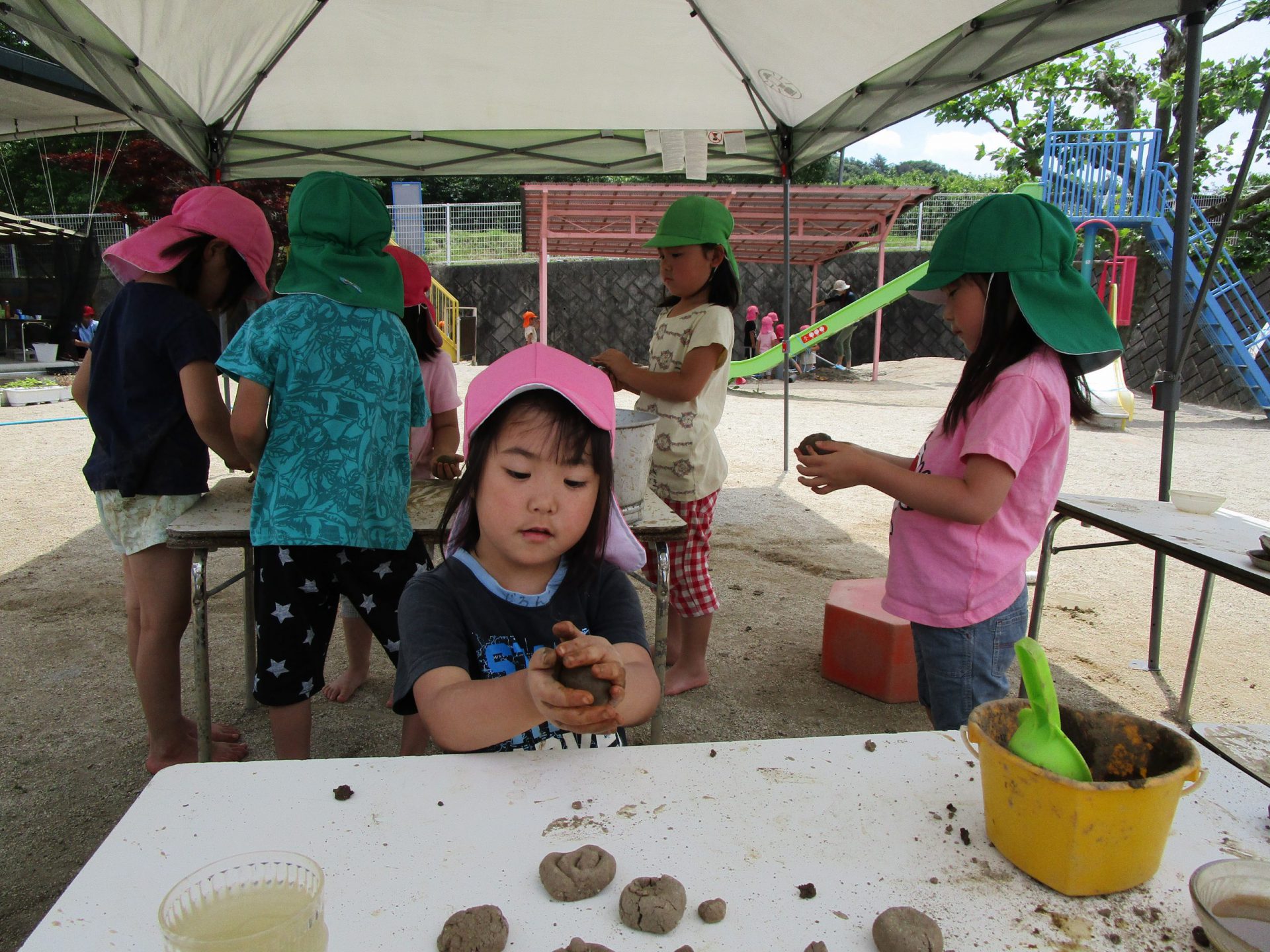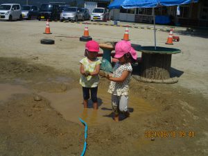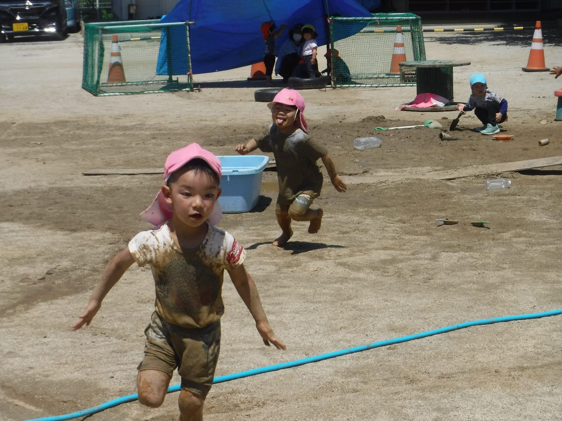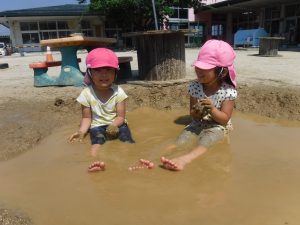 ・園庭に全園児が出て泥んこ遊びを楽しみました。砂や土に水が混ざることで形が変化したり、とろけたりするおもしろさを味わったり、太陽の熱で水の温度が上がり、温かくなることなど自然の中でのいろいろな現象を体験していけることを感じました。また、年齢に関係なく、いろいろな場面で子ども達が遊ぶことで、自然に真似をしたり、教えあったりする姿があり、お互いのいい刺激になっていくことも感じられました。