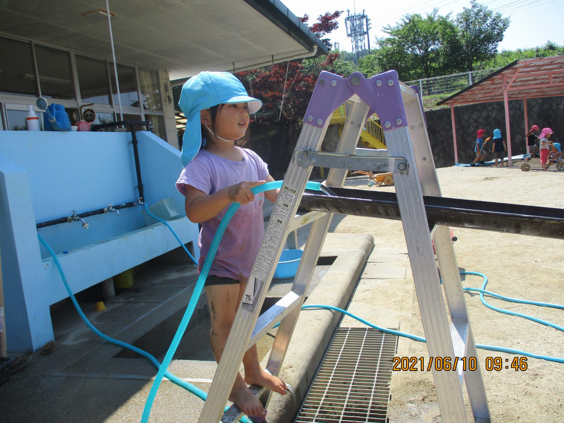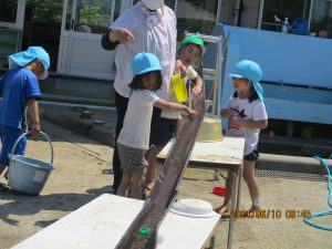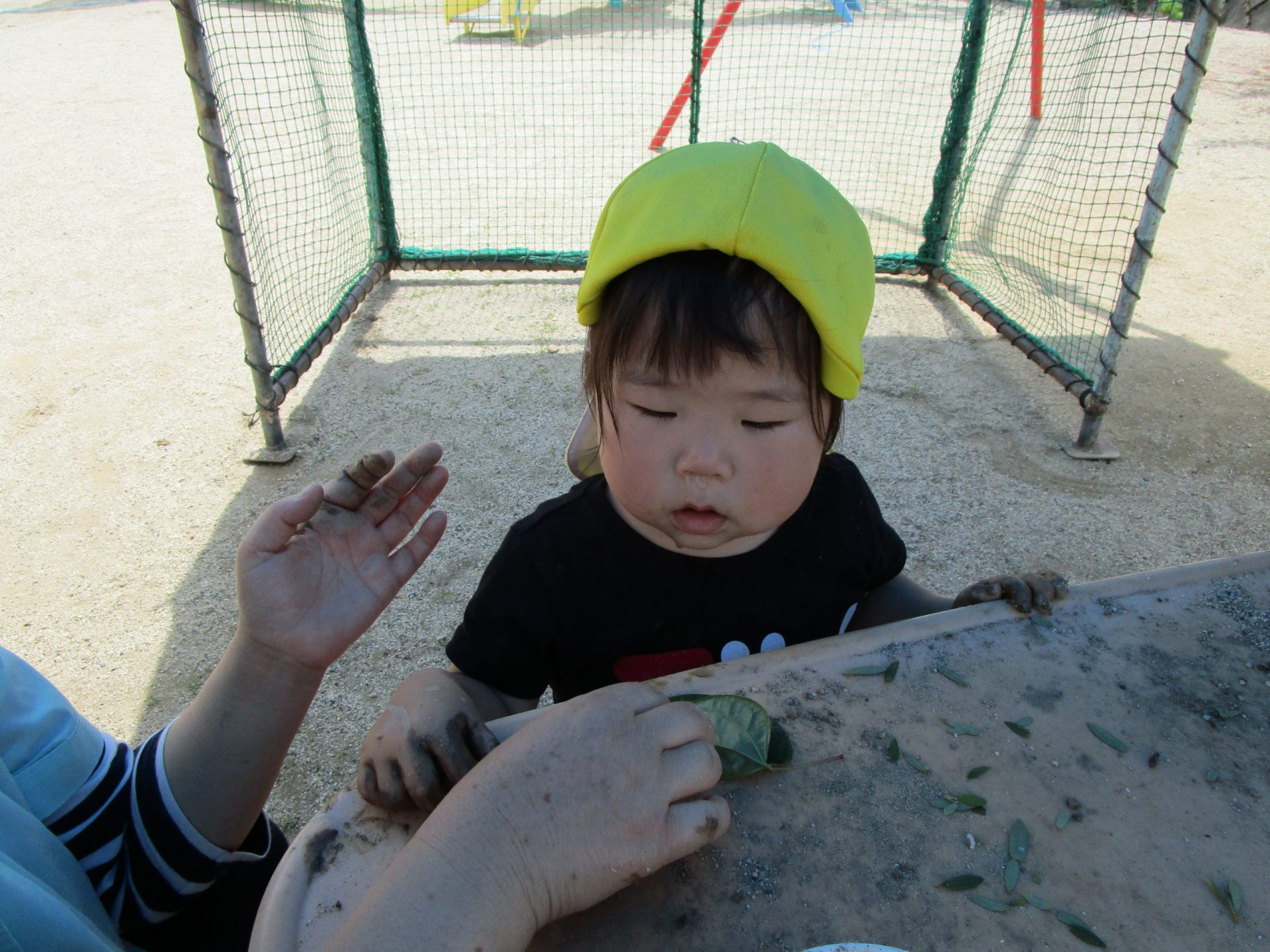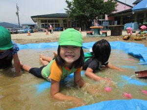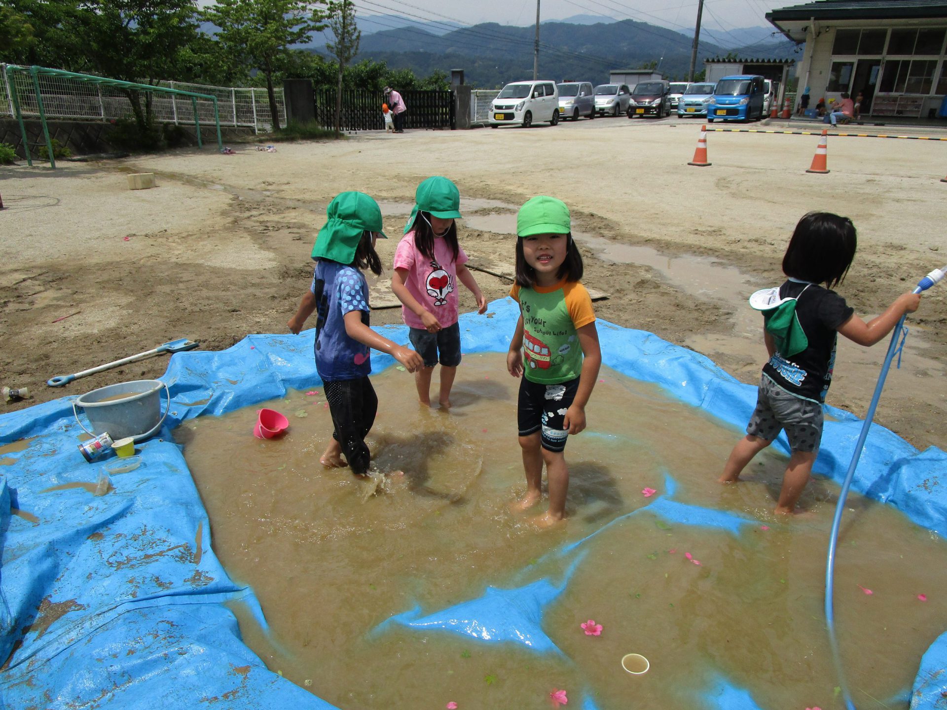 ・園庭に全園児が出て泥んこ遊びを楽しみました。砂や土に水が混ざることで形が変化したり、とろけたりするおもしろさを味わったり、太陽の熱で水の温度が上がり、温かくなることなど自然の中でのいろいろな現象を体験していけることを感じました。また、年齢に関係なく、いろいろな場面で子ども達が遊ぶことで、自然に真似をしたり、教えあったりする姿があり、お互いのいい刺激になっていくことも感じられました。