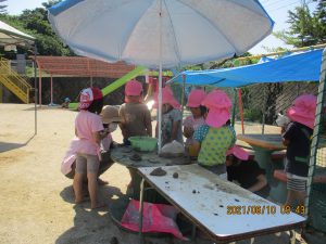 パラソルの下の日陰では泥んこを使ってパン作りや泥んこジュース作り。