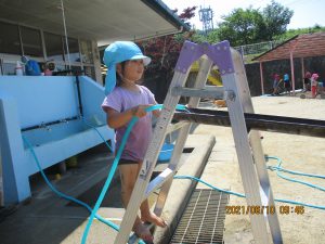 脚立にトヨを置いて水を流してみます。ペットボトルの蓋やおもちゃなど流してみます。