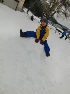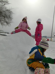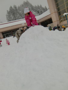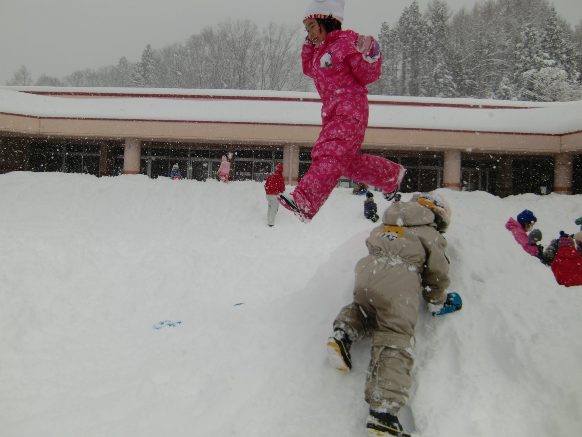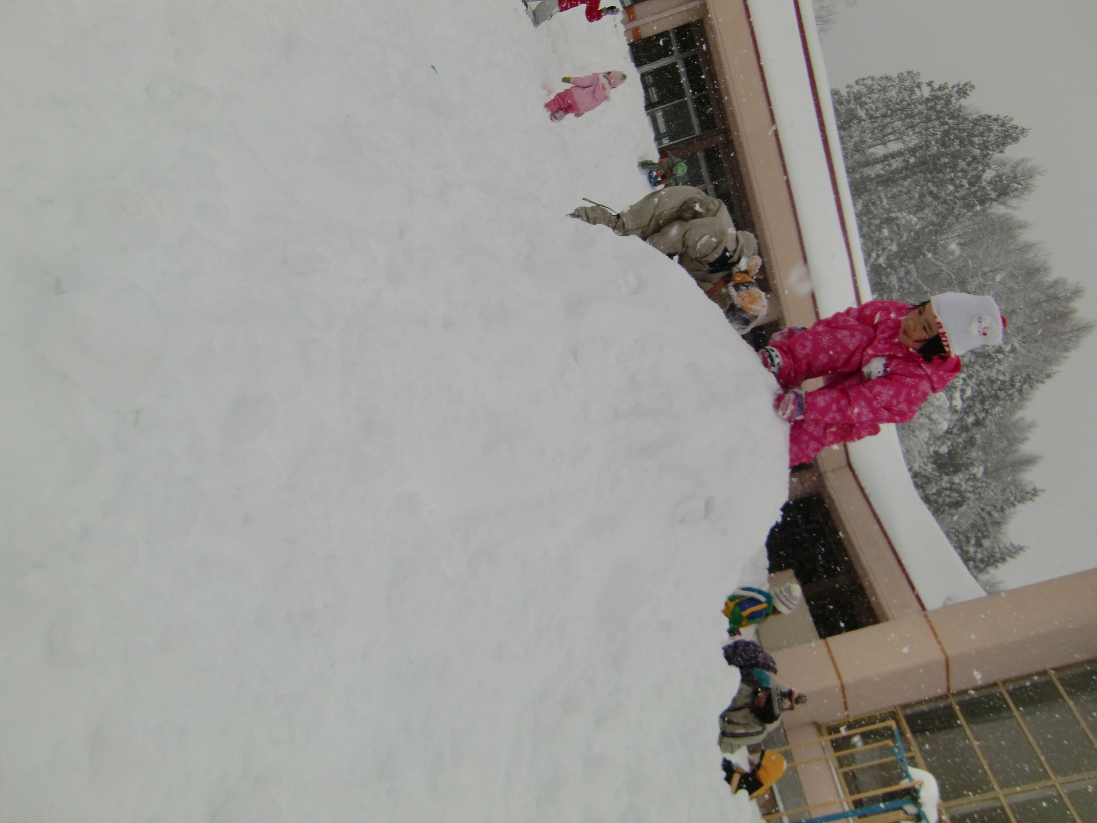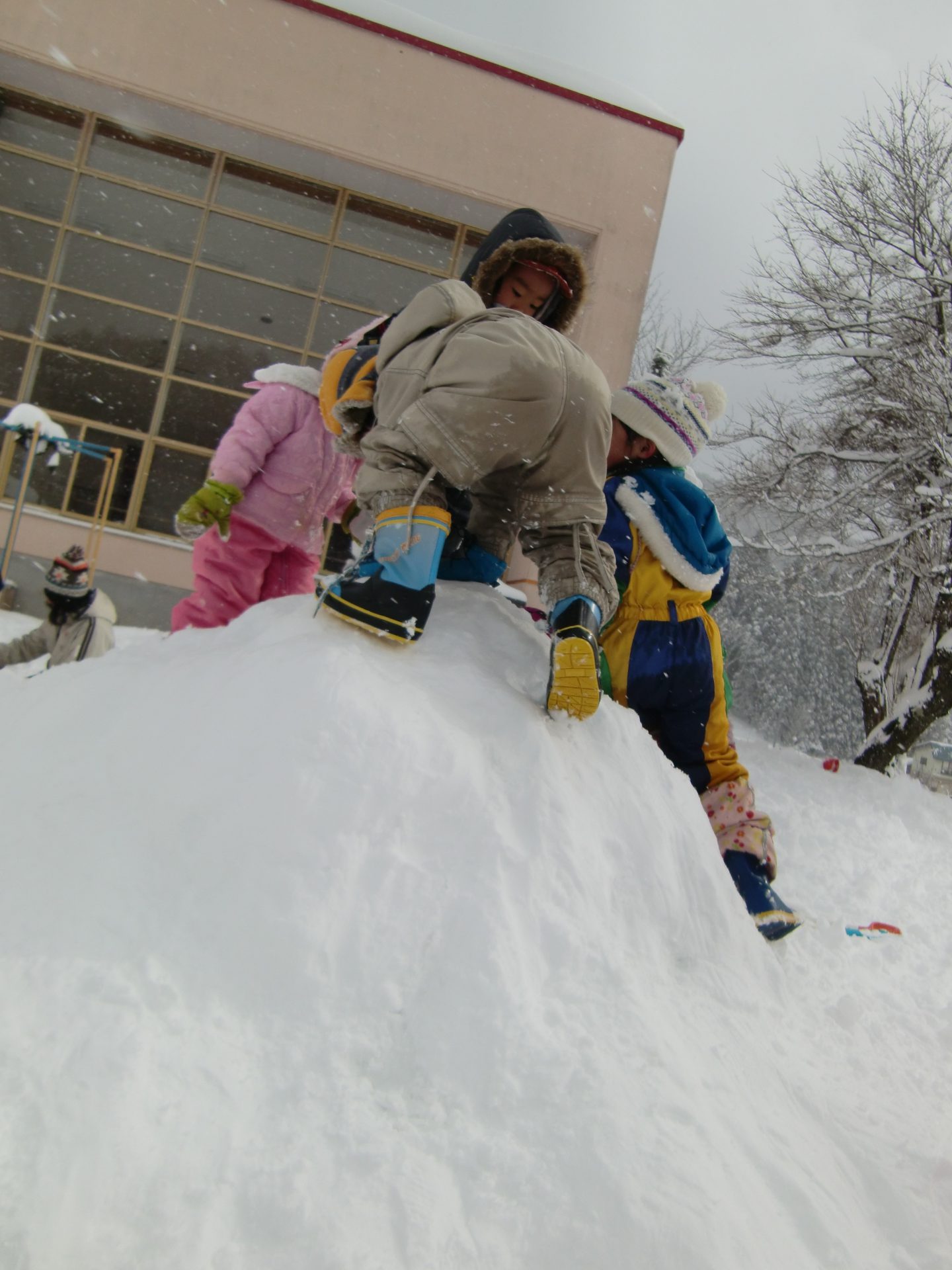 園庭には、年長さんが作ってくれた雪山があり、年少児も登ったり滑ったりと楽しく遊ばせてもらっていたのですが…。