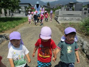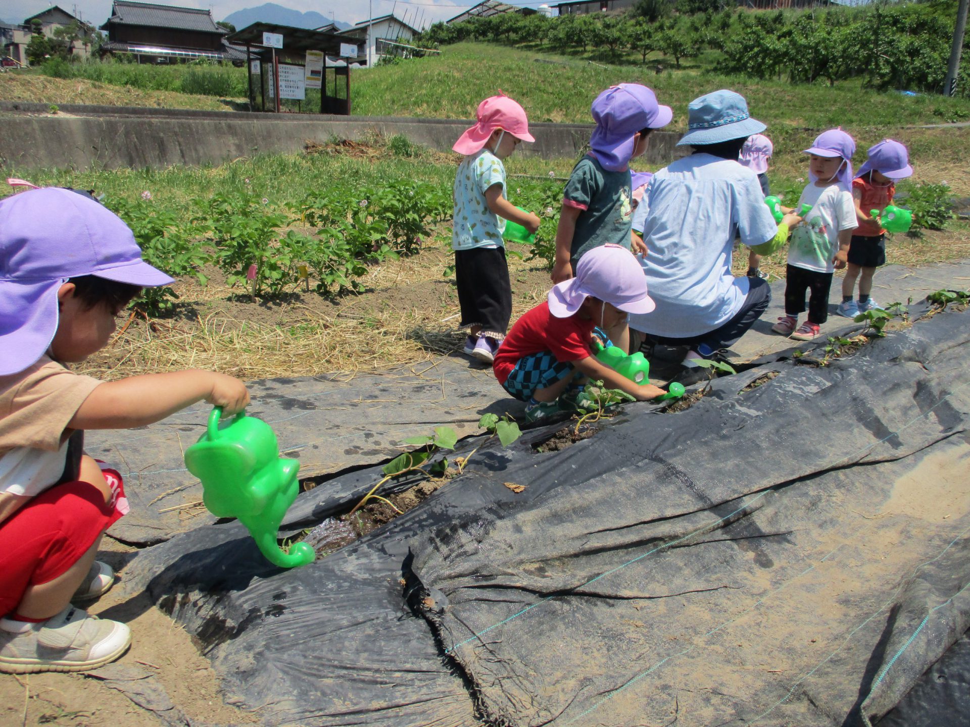 ・以上児のお友だちが植えたサツマイモの苗、大事に植えて水やりをしたのを応援しながらみていた1.2歳の子ども達、今日は自分たちで保育園から少し離れサツマイモの畑に水やりに行きました。