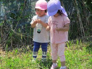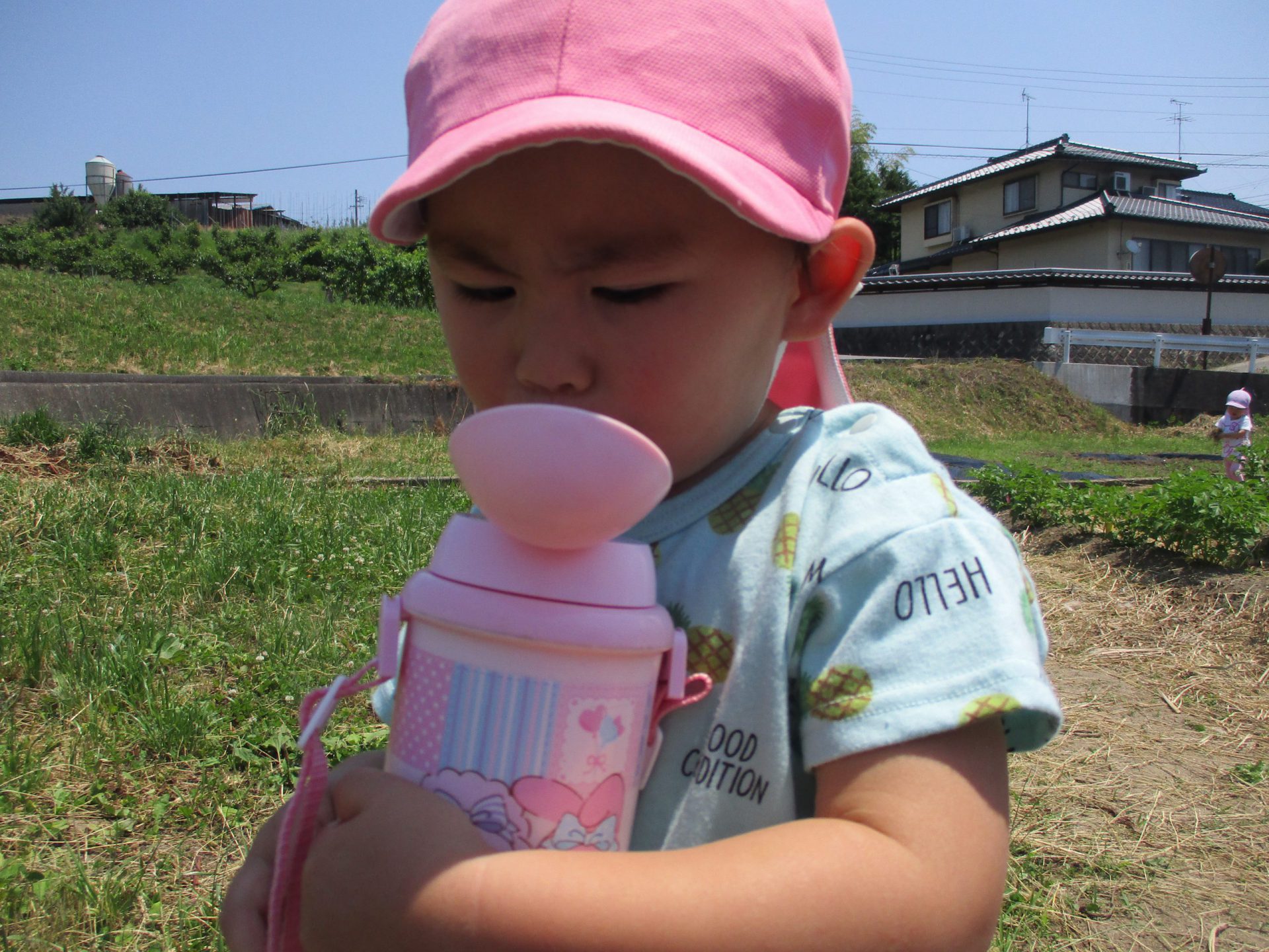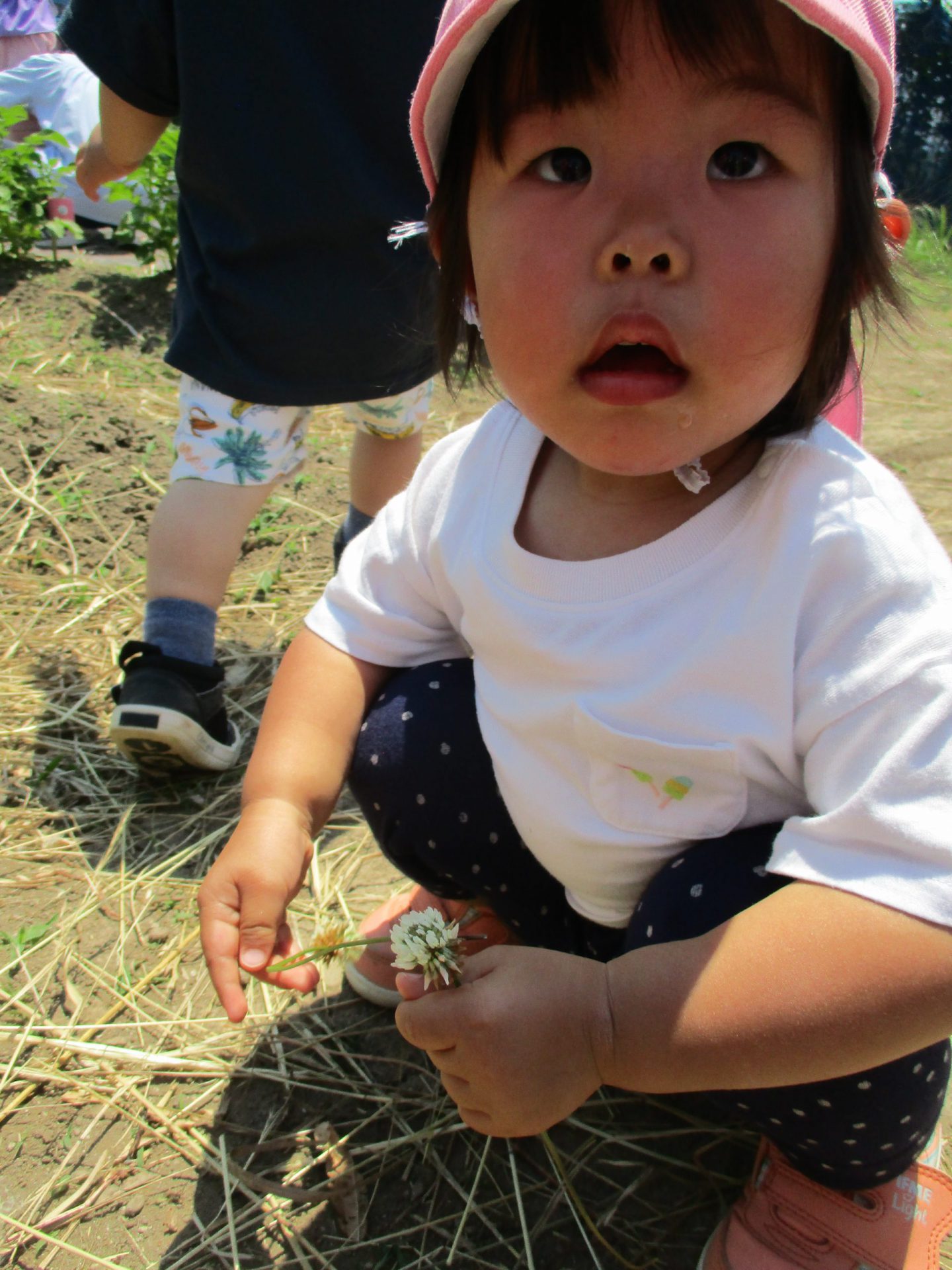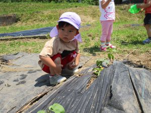 ・とても暑い日だった。芋の葉が前よりも緑色で元気そうです。Aくんが葉っぱが出ていることを皆に伝えていた。苗に敷いてあるワラを手に取ってみたり、たんぽぽがあることに気づいて取ってみたりと、畑にあるものに興味を持ち、触れてみる姿がある。手触りやにおいなどを感じているのだろうか?