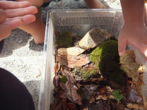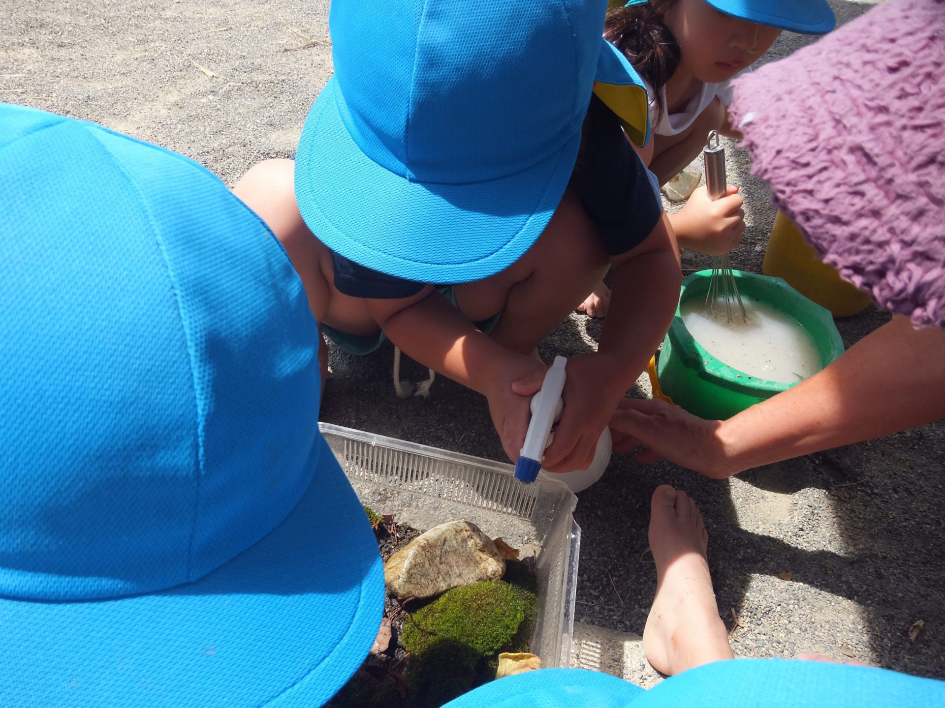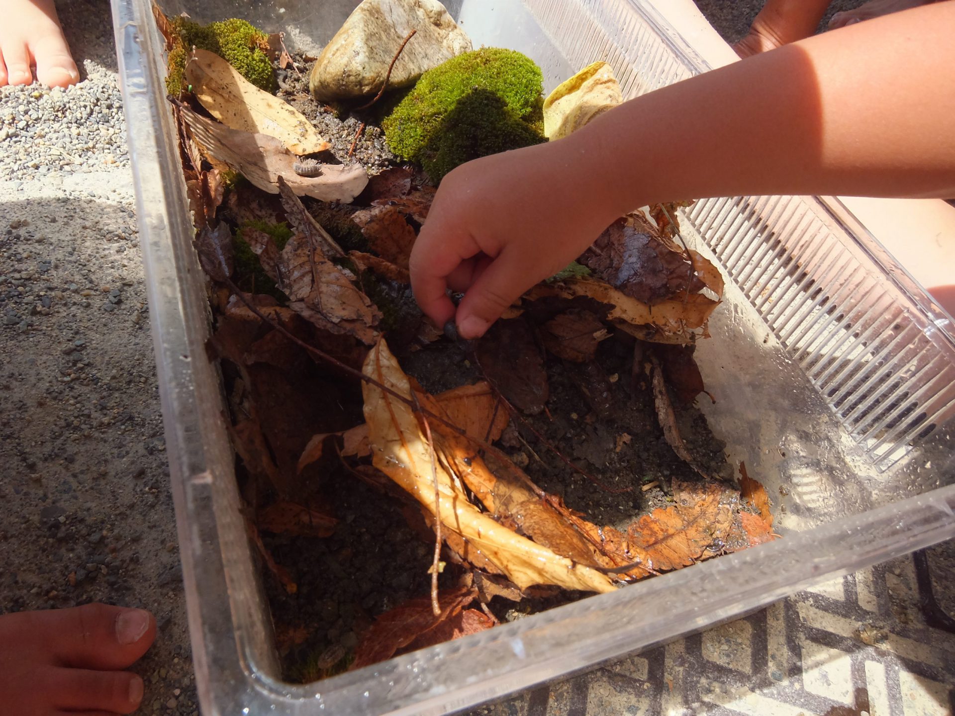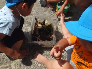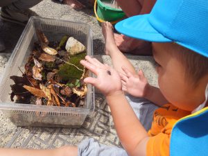 子ども達に虫を身近に感じて触れ合ってほしいと願い、だんごむしを飼い始めました。予想どおり、子ども達は興味津々!