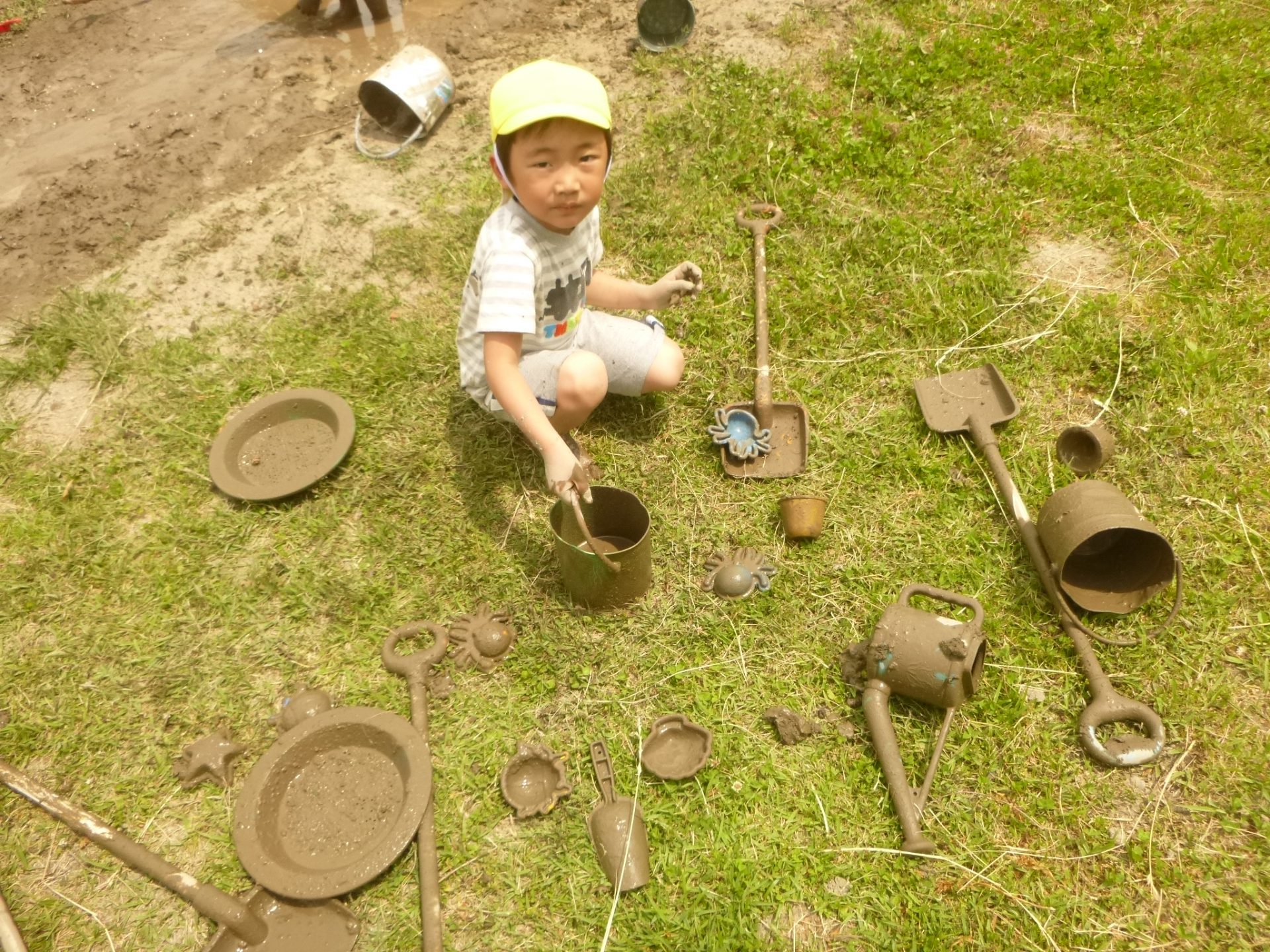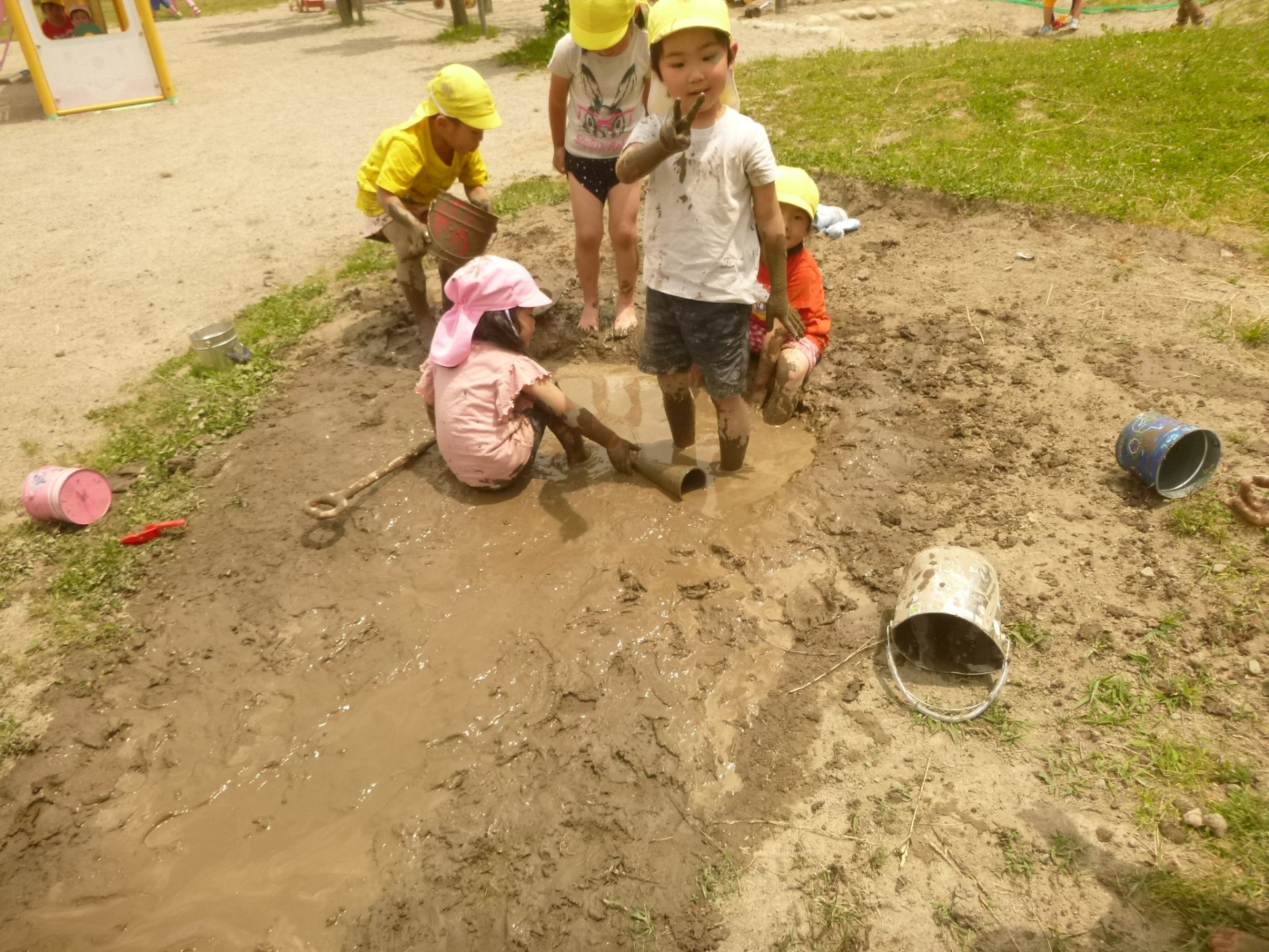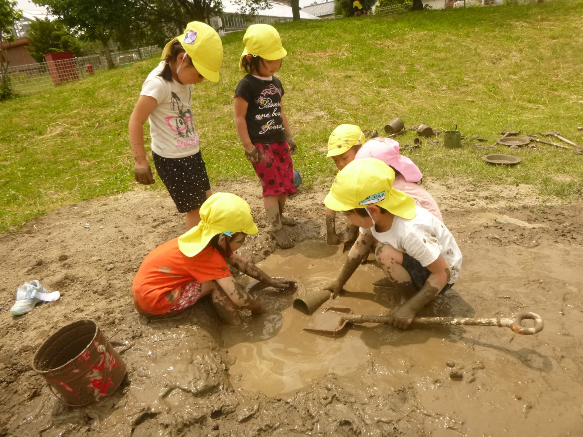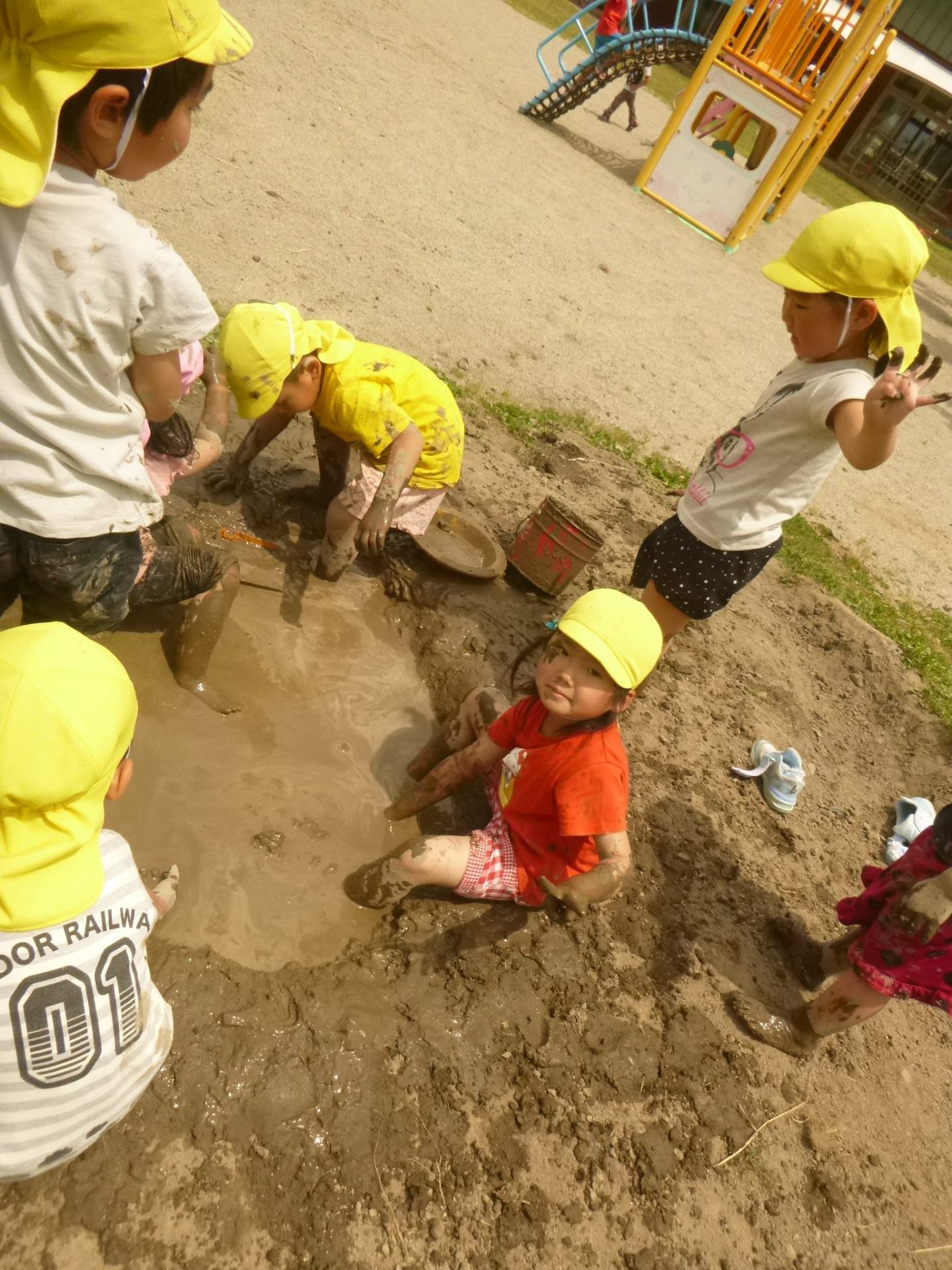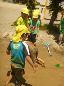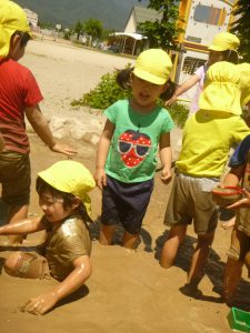 初めは見ていたお友達も、楽しそうなみんなの姿を見て「やってみたい!」と自分から泥んこ滑り台を楽しむようになりました。今では「今日もやりたい」と自分から遊びだす姿へと変わってきています。これからも心地よい泥の感触をダイナミックに楽しめるよう、子ども達との遊び場作りを楽しんでいきたいと思います。