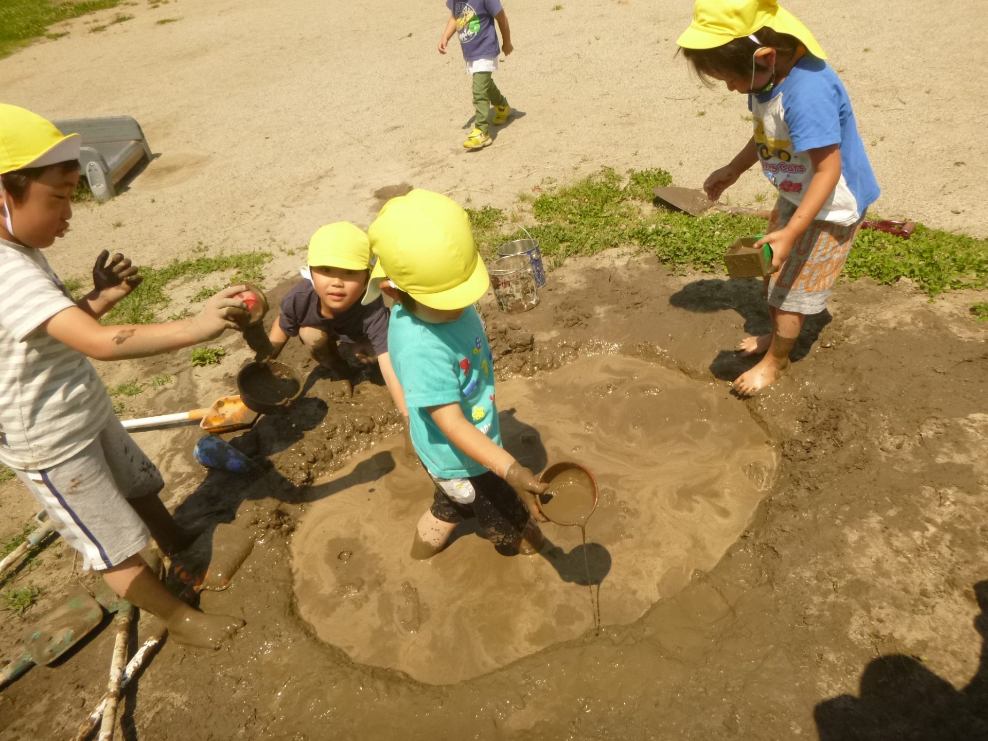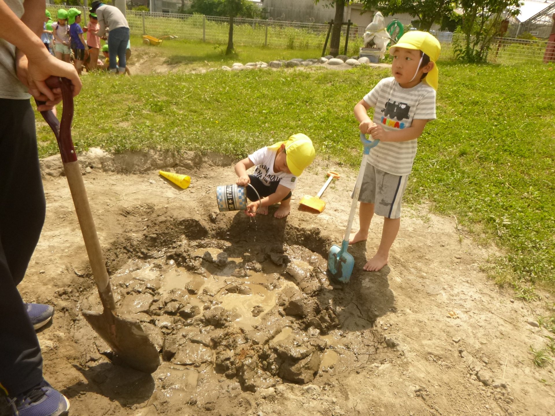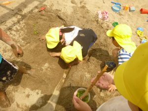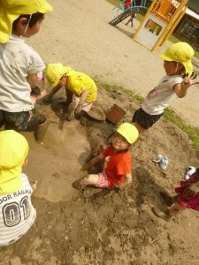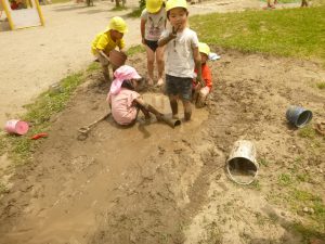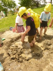 大好きな泥んこの場所が毎日の遊びの中で少しずつ広がってきました。「今日も土を掘るよ!」「遊ぶ前にやわらかくしないとね」