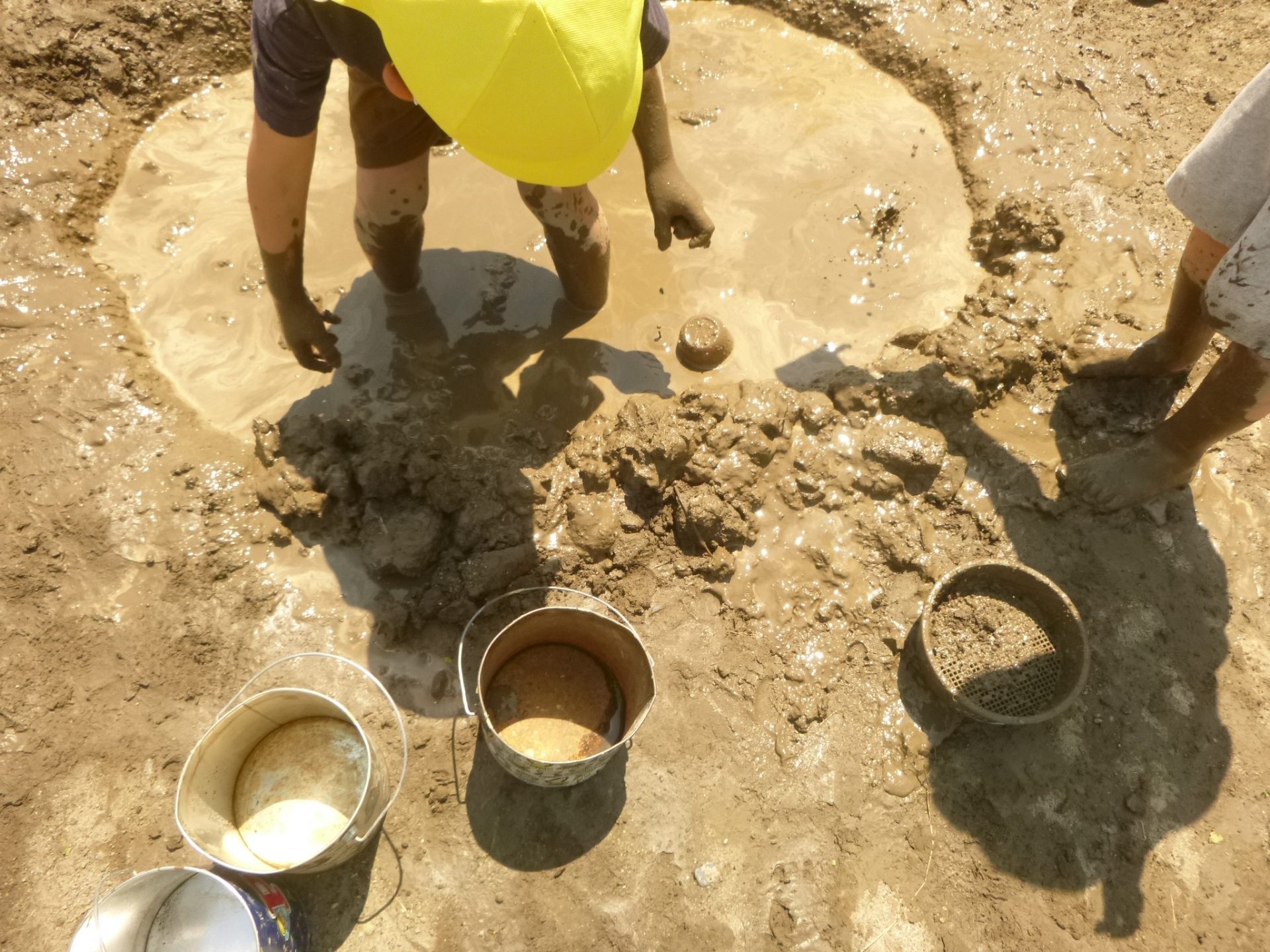 足でこねているうちにやわらかくなっていきます。「OK!」「ドロドロになってきたよ」