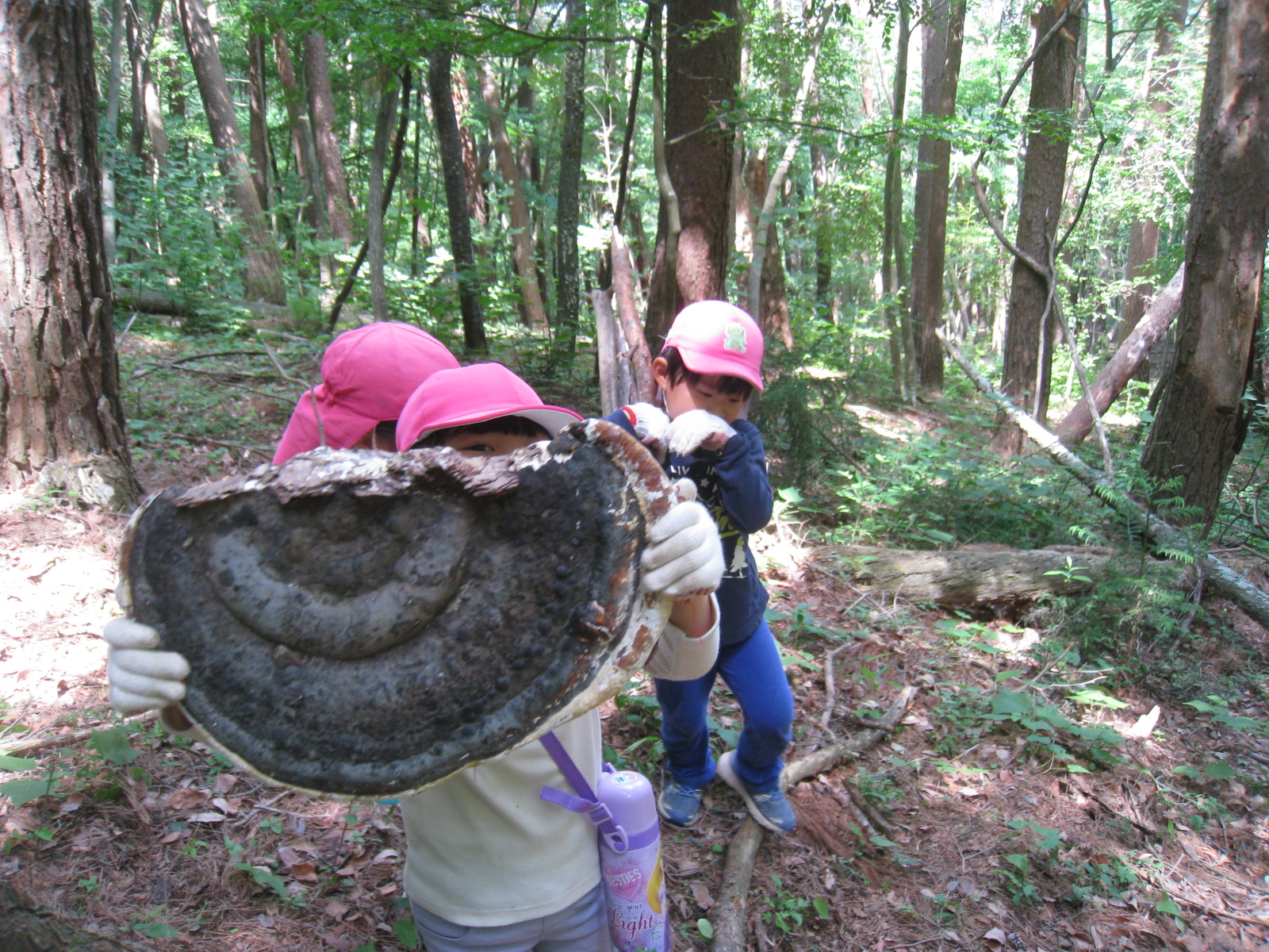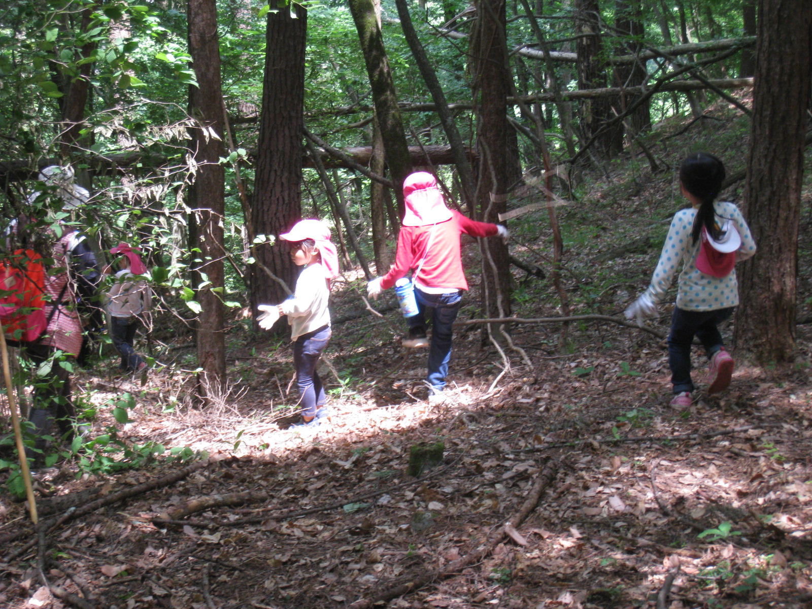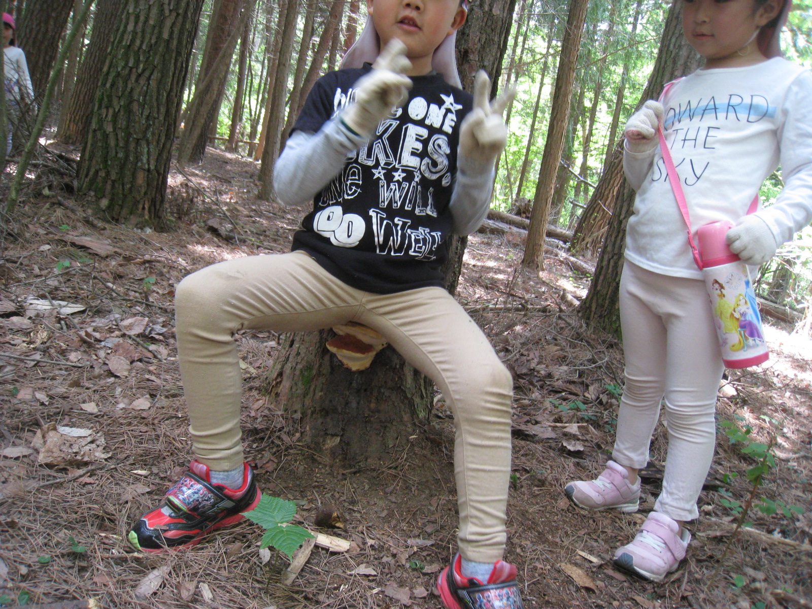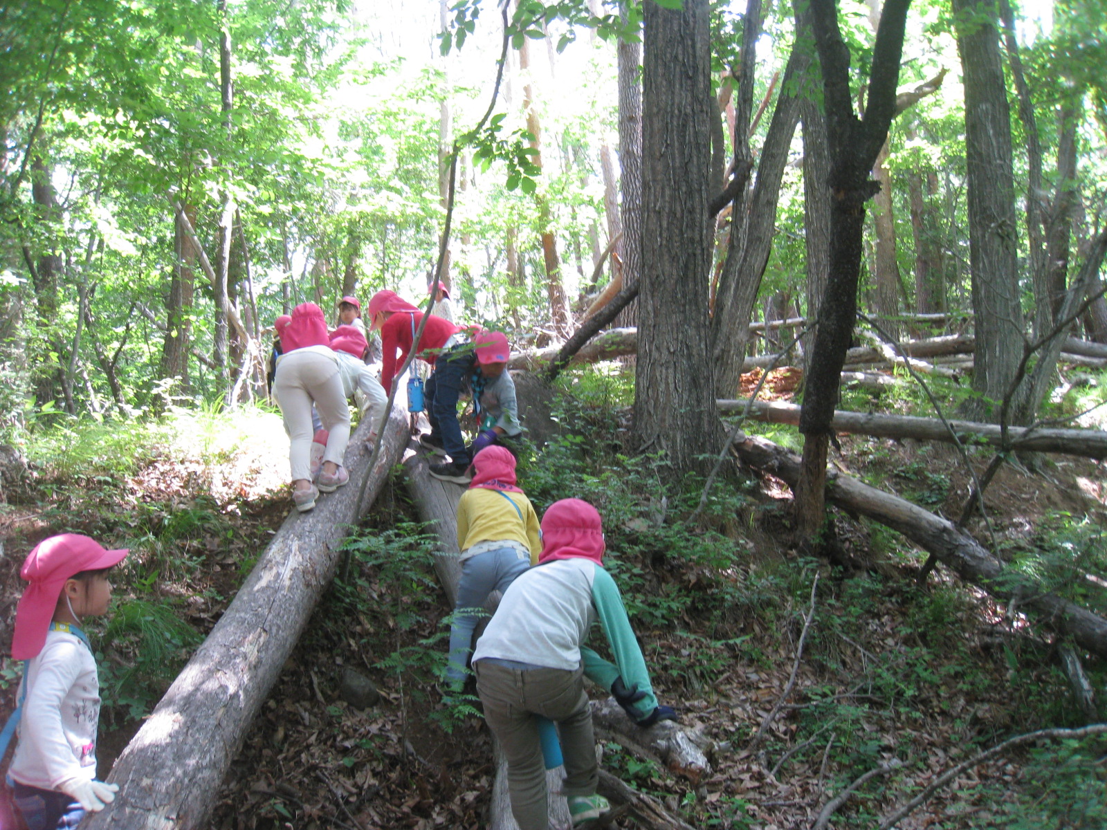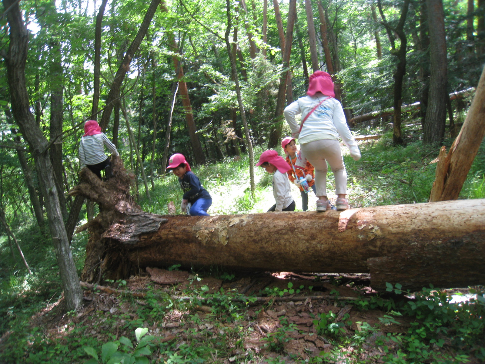 丸太の一本橋を渡ったり、またいだり、どんどん進んでいきます。山道を歩くのも平気になり、どんどん進んでいきます。