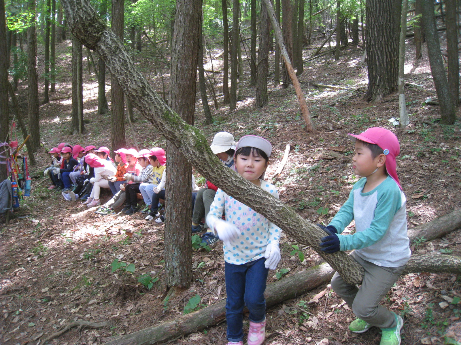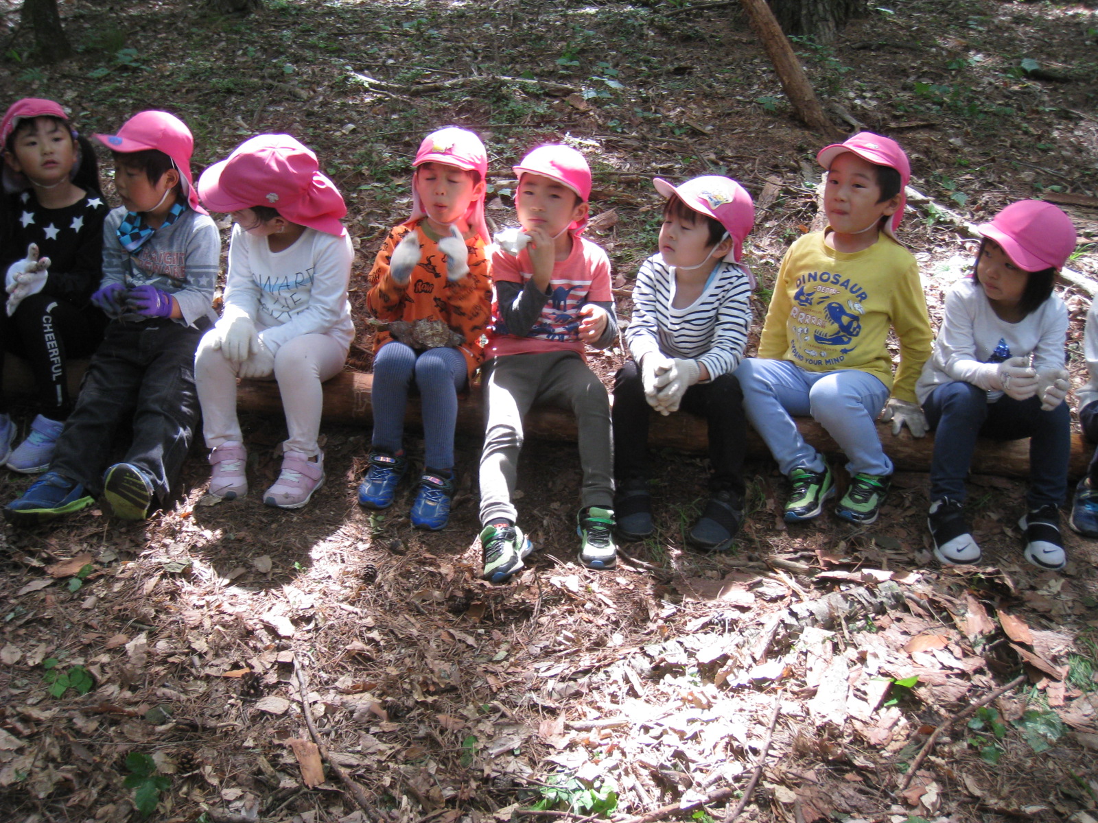 子どもたちが座っている丸太はみんなで木の皮をむいて座り心地を良くしたそうです。