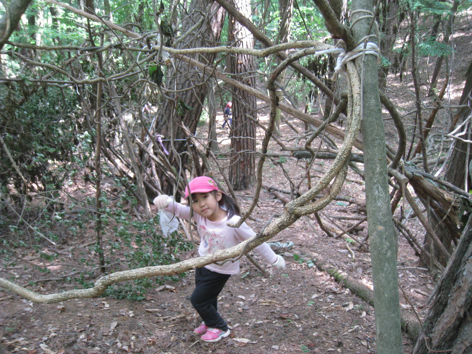 さあ、みんな思い思いの場所で遊びます。ツルのブランコやターザンごっこの他に、こんな秘密基地も作成中。