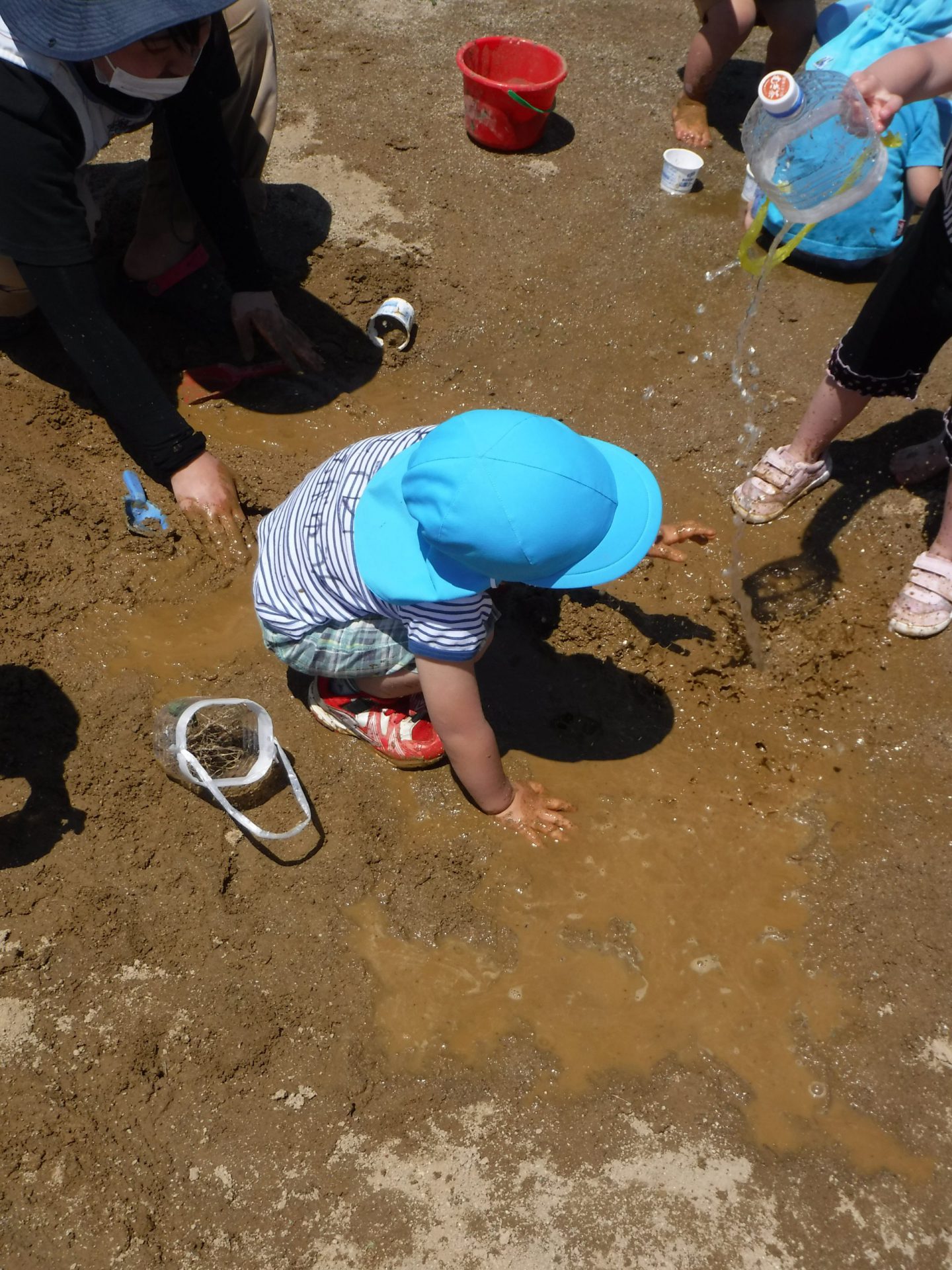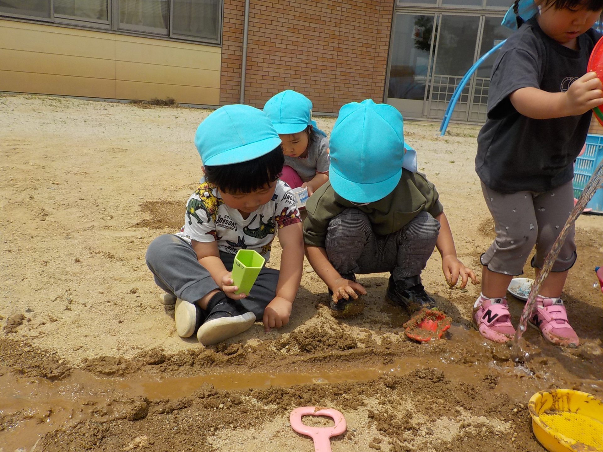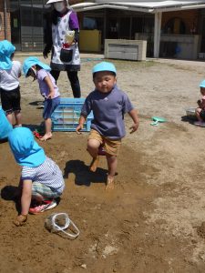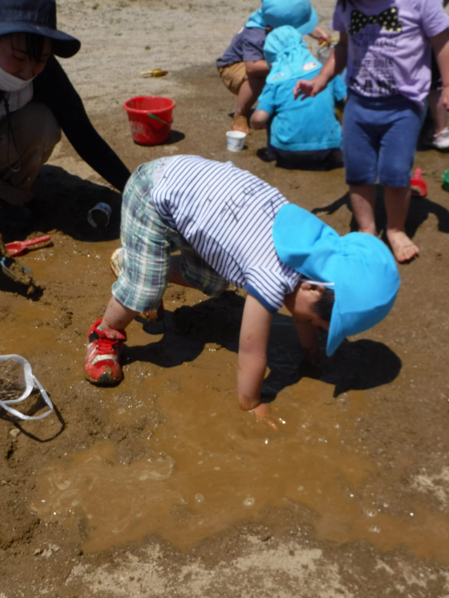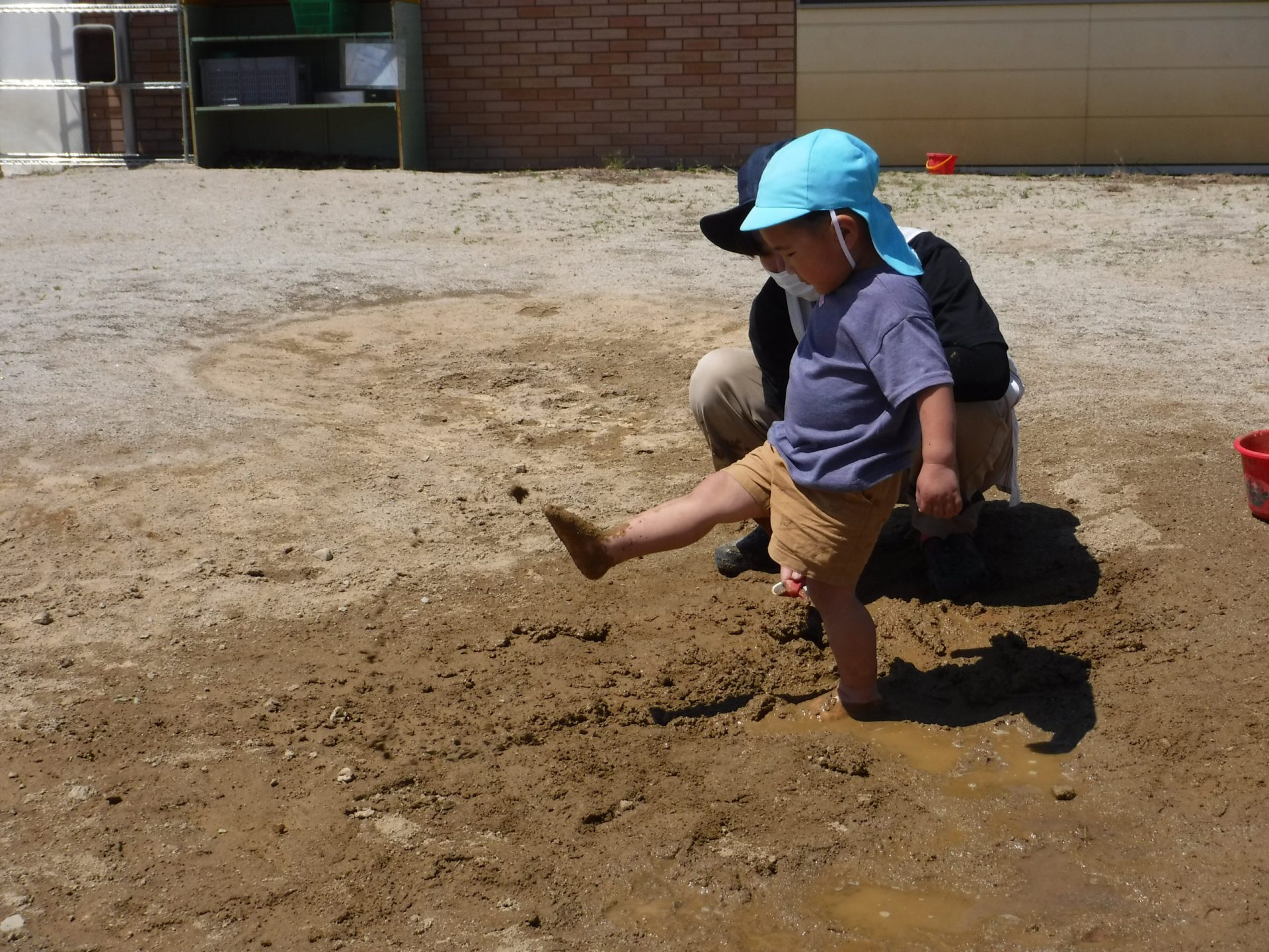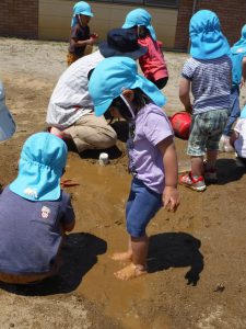 水や砂遊びは抵抗なく楽しめる子どもたちですが、泥にはまだ少し抵抗があるこどもたちもいます。