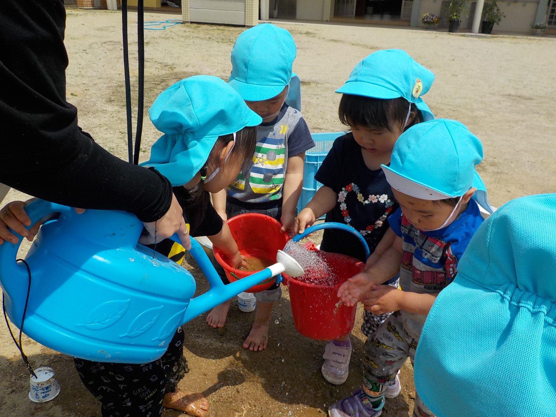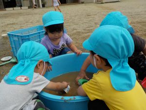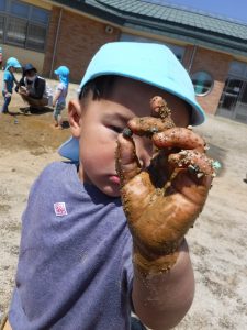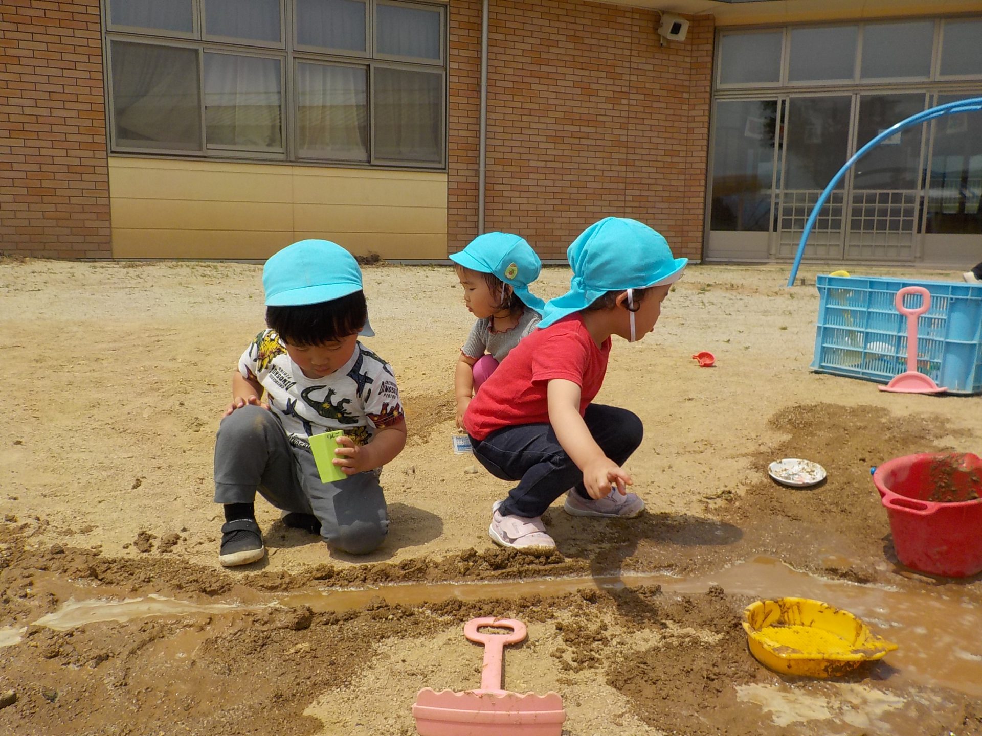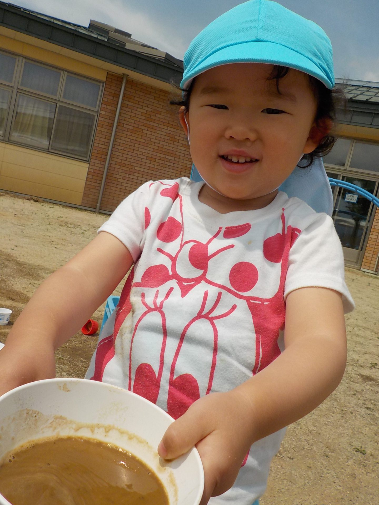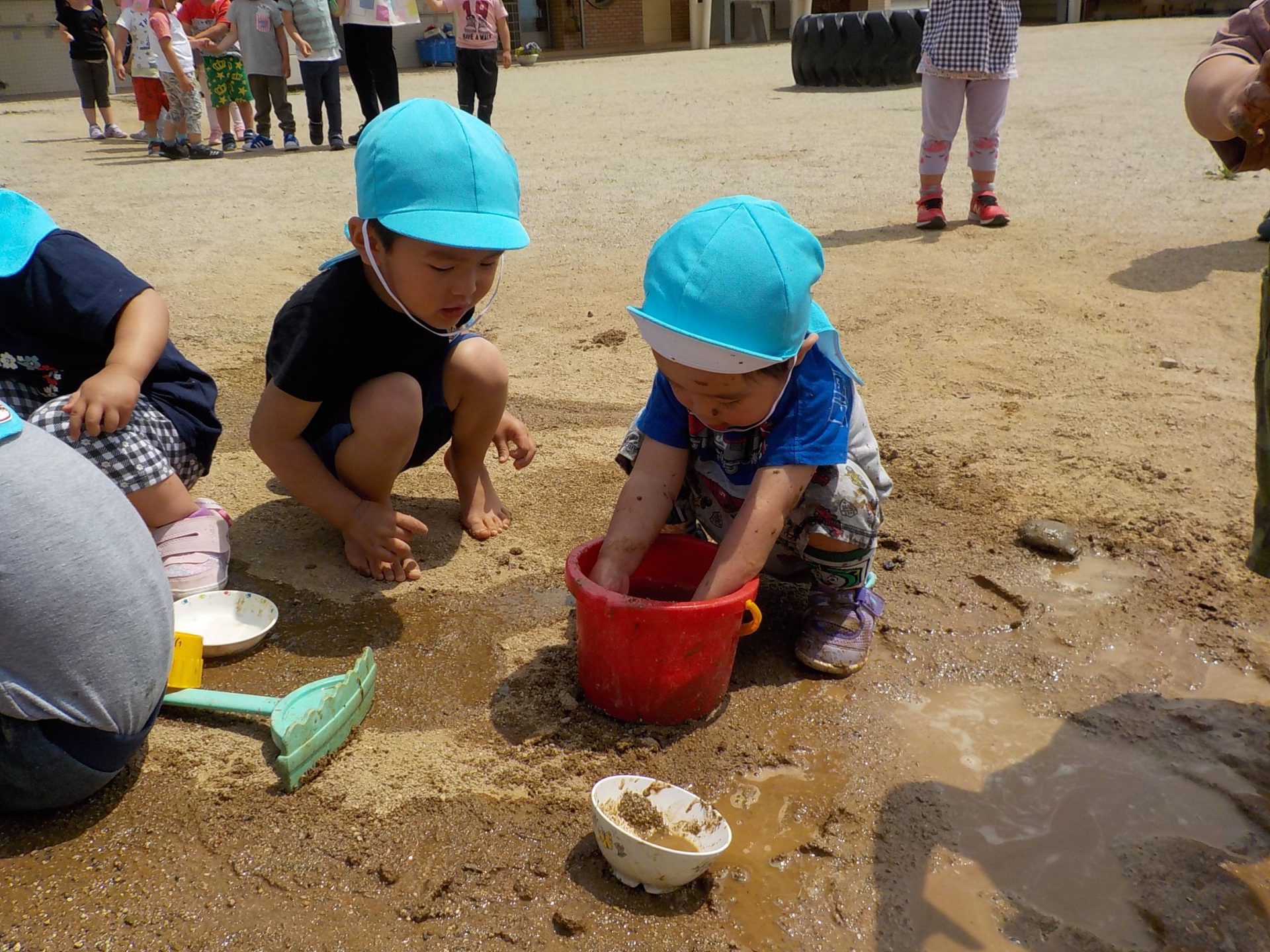 水や砂遊びは抵抗なく楽しめる子どもたちですが、泥にはまだ少し抵抗があるこどもたちもいます。
