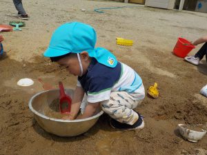 と言ってスコップを持ってきてくれ、保育士も一緒に砂と水をまぜまぜしました。まぜまぜ・・・。