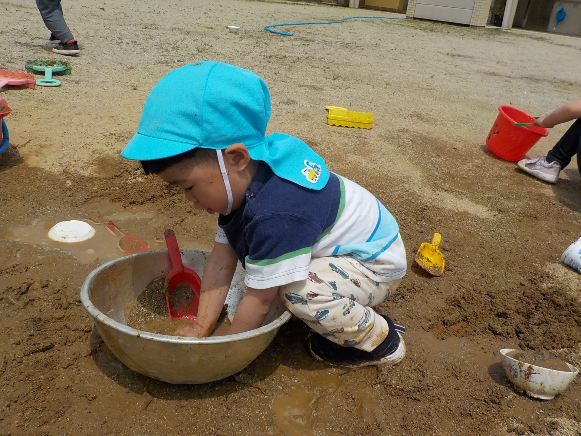初めは砂だけで遊んでいた子も、泥や水に触れ、大胆に遊ぶ姿が増えてきました。