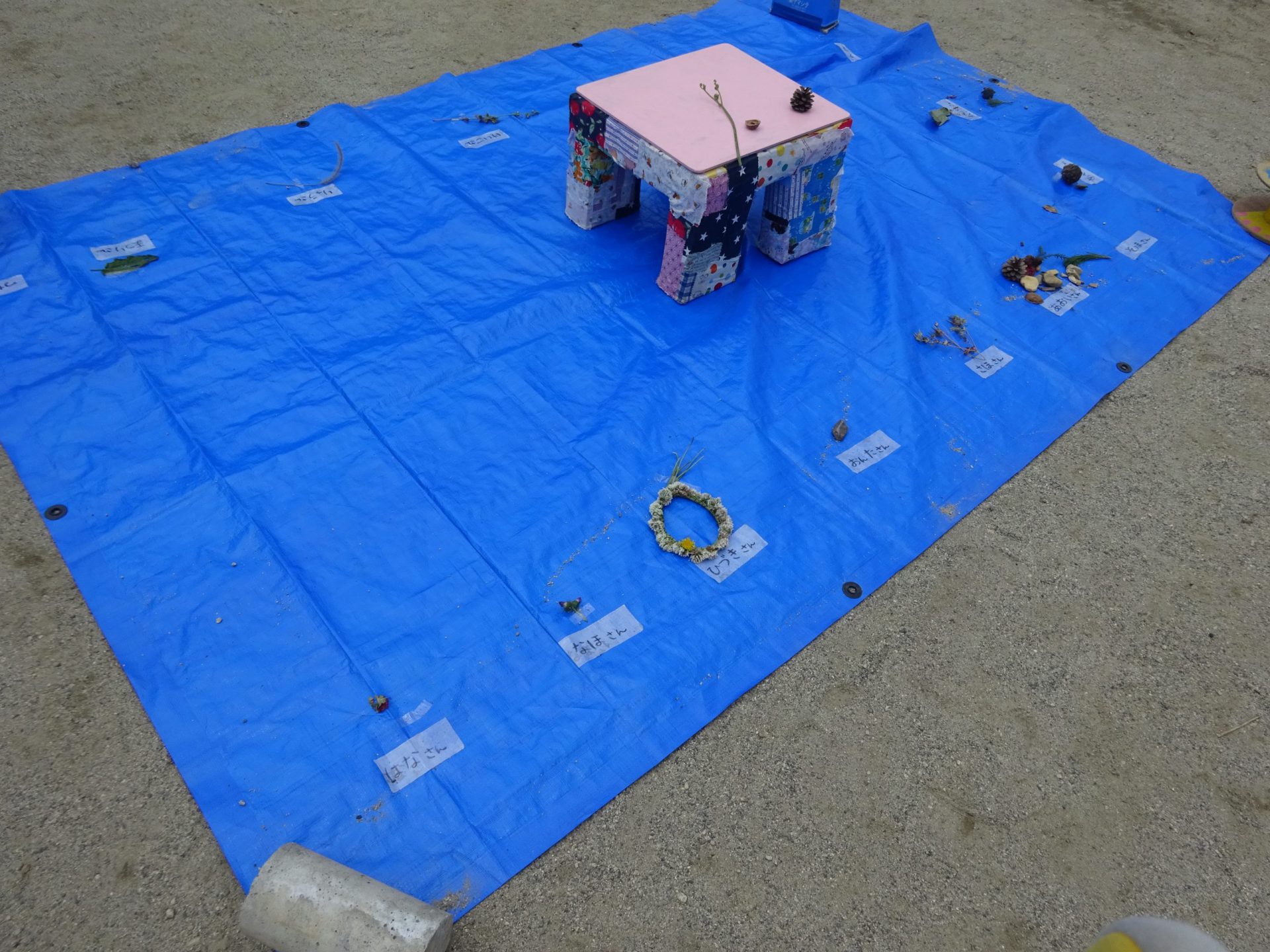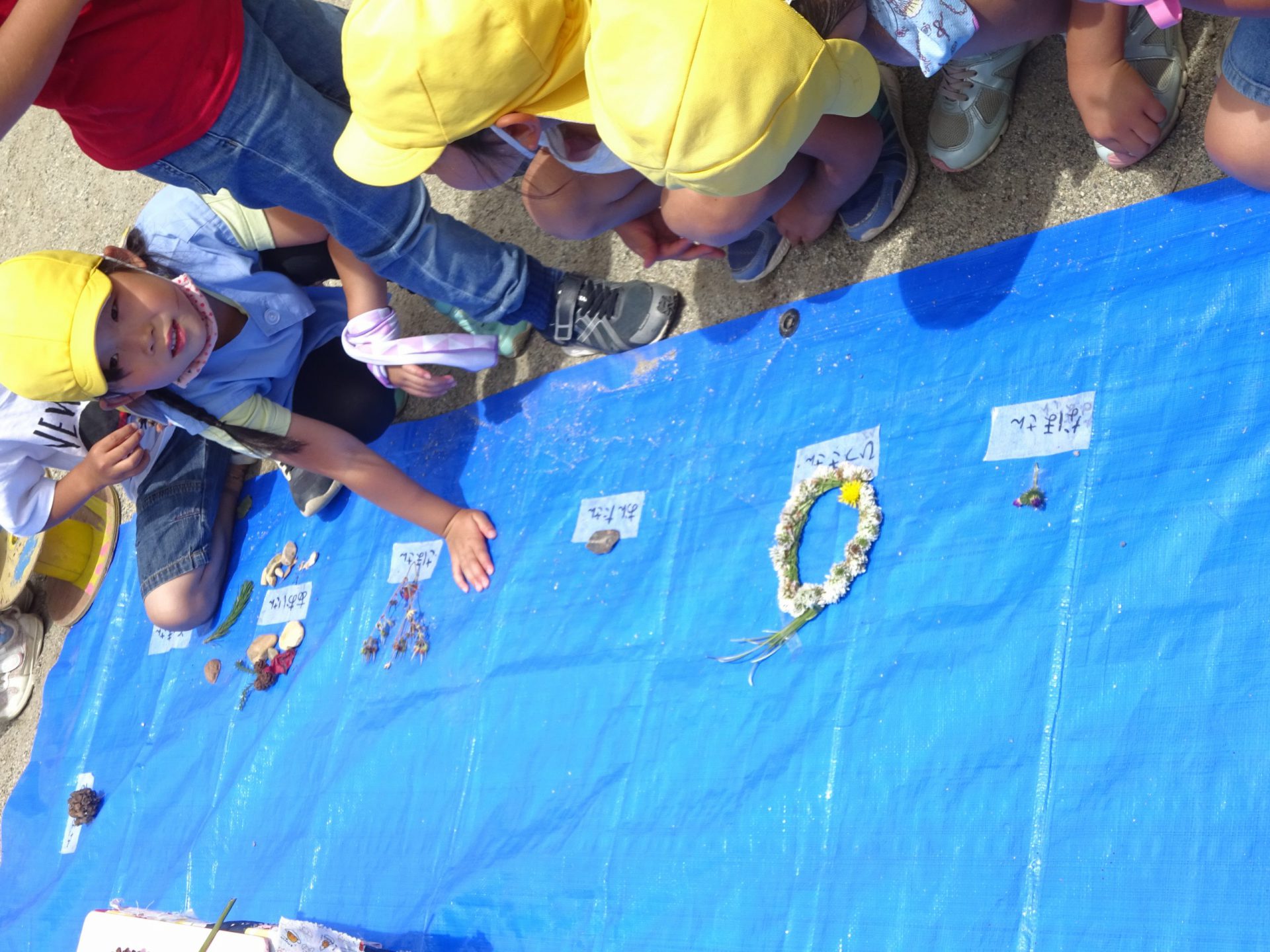 「お花がハートの形た!すご~い。」「ツルツルの石をいっぱい拾ったんだね。」「トゲトゲの枝がある!触ると痛そう・・・」「あのフワフワしたものは羊の毛かな・・?柔らかくて気持ちよさそう。」
