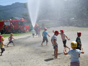 地区の消防団のお父さん方による放水後のお楽しみ♪